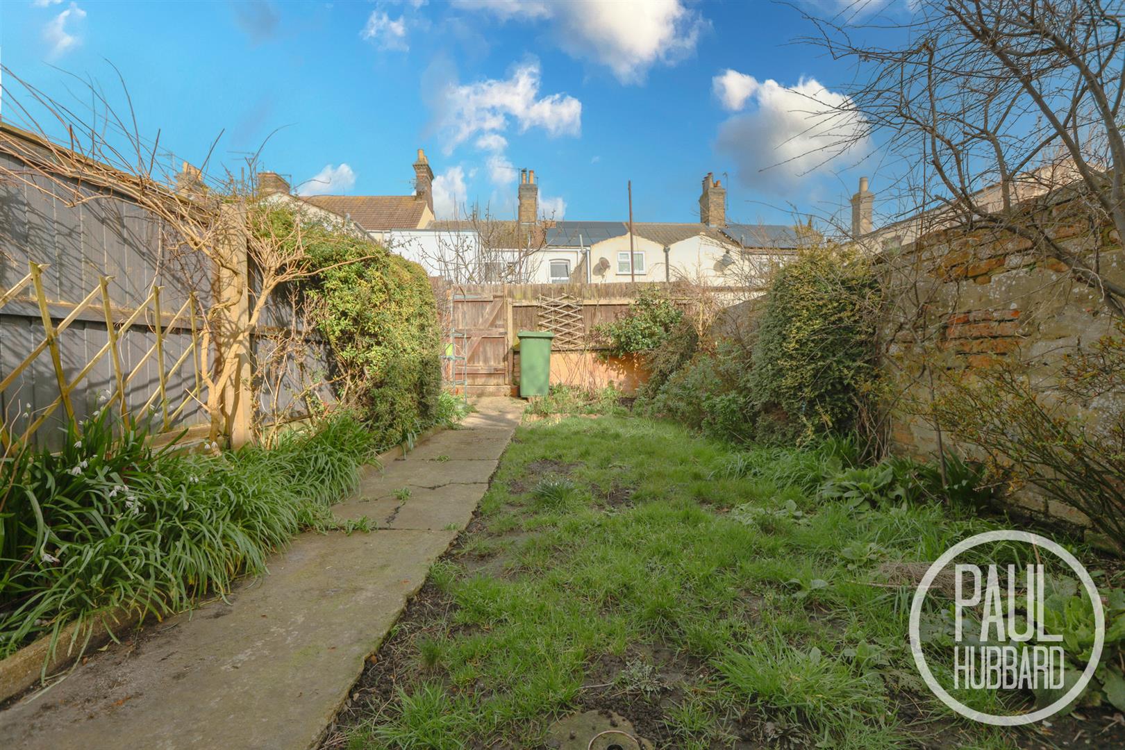 To the rear of the property, a concrete pathway leads to an aluminium storage shed and two brick-built outhouses. A lawned garden with mature shrub borders extends to a timber gate, providing rear access.