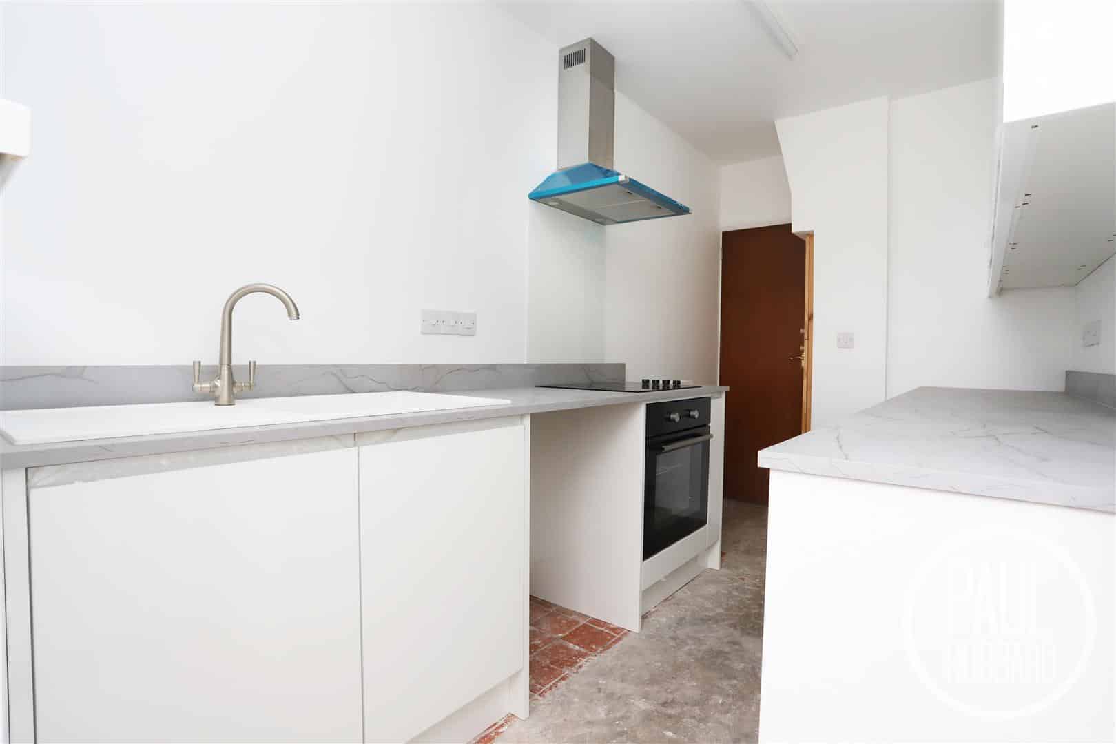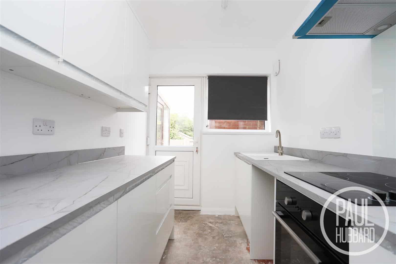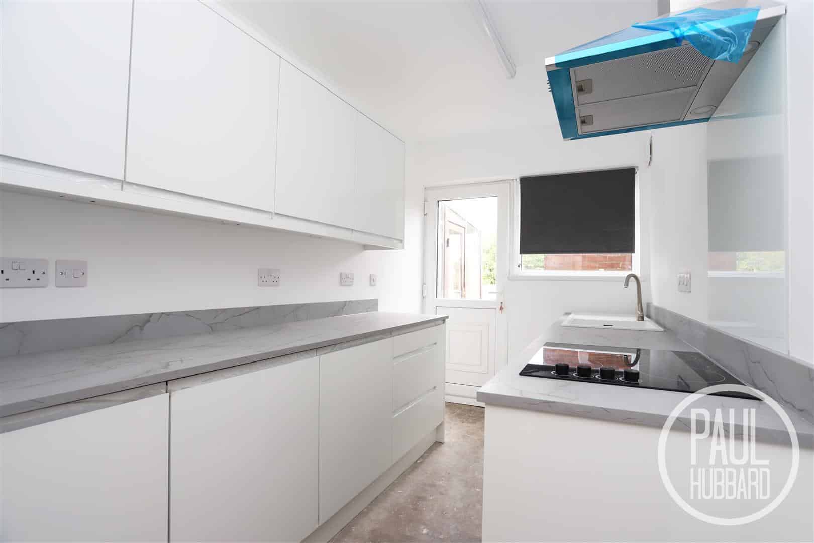 A brand new kitchen featuring a radiator, units above & below, soft close cabinets, laminate work surfaces, inset composite sink & drainer with mixer tap, built in oven, electric hob & a stainless steel extractor fan, integrated fridge & freezer, space for a washing machine and a UPVC double glazed window & door to the rear aspect.