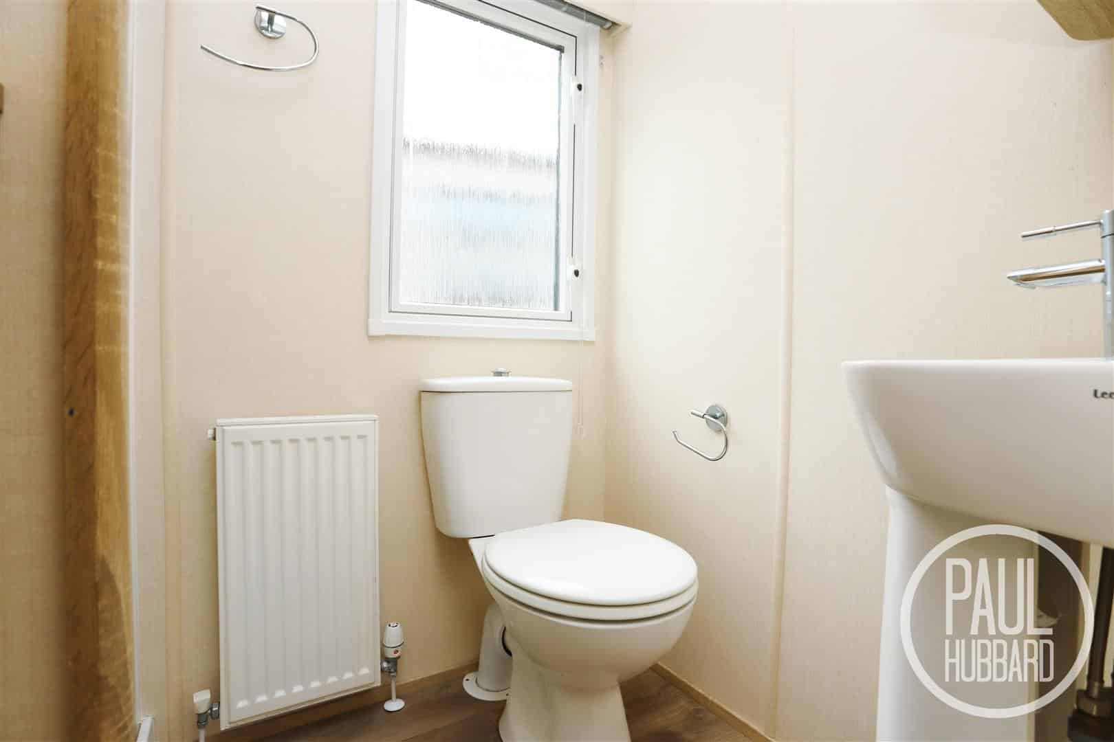 Vinyl flooring, UPVC double glazed obscure window to the side aspect, radiator, toilet, and pedestal wash basin with mixer tap.