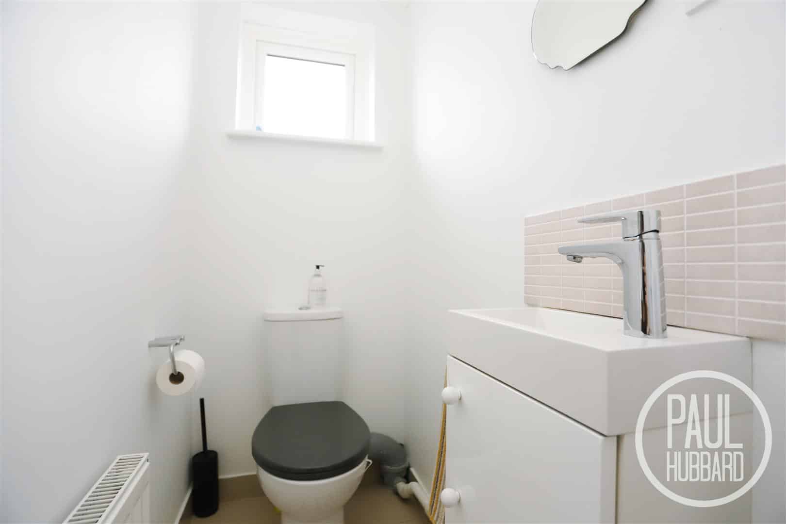Tile flooring, UPVC double glazed obscure window to the side aspect, toilet, wash basin set into a vanity unit with a mixer tap, radiator and a tile splash back.