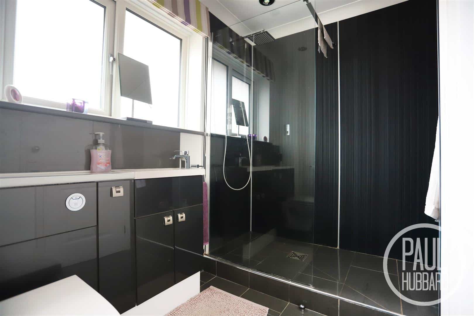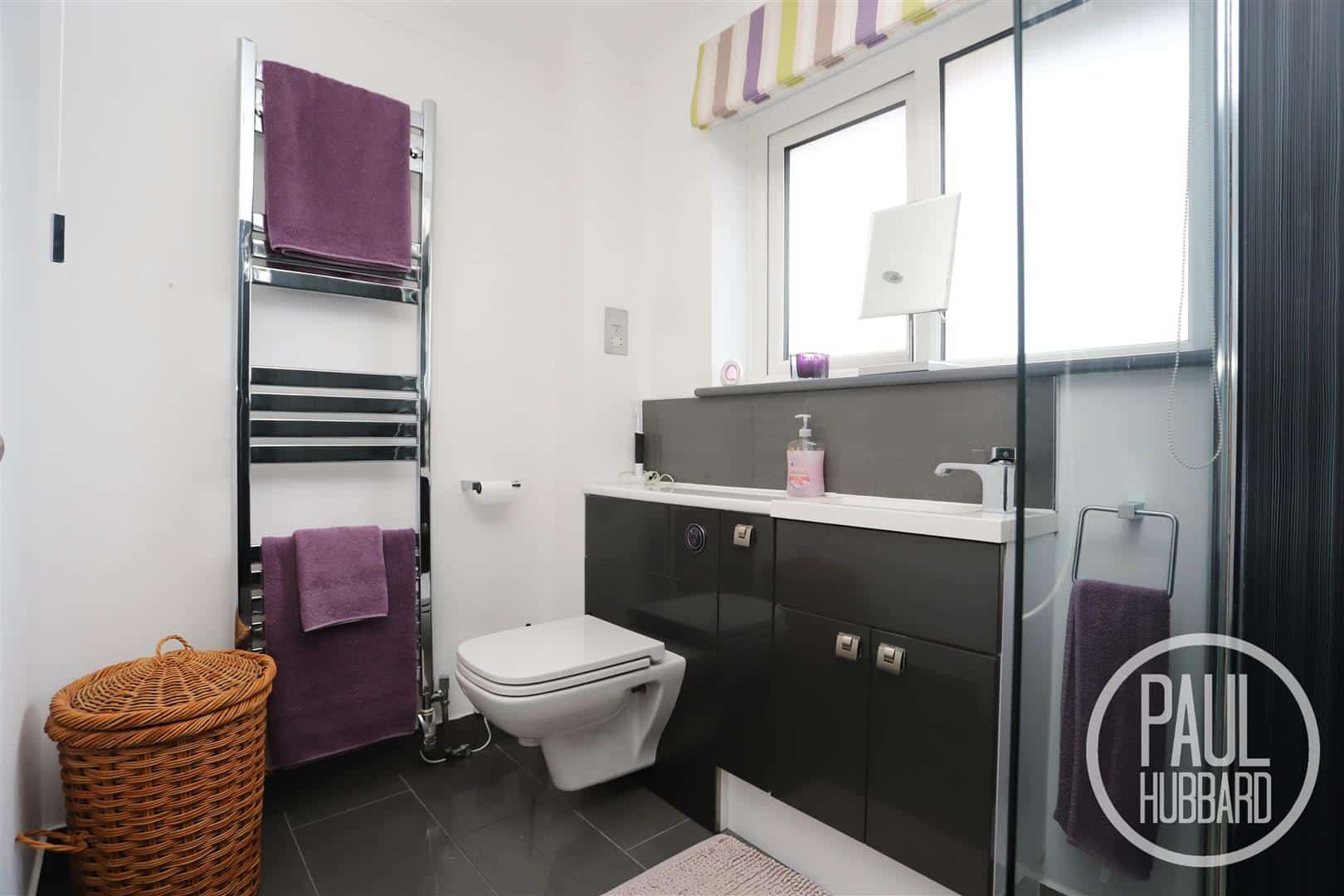 Tile flooring, UPVC double glazed obscure window to the rear aspect, spotlights, shaving point, heated towel rail, extractor fan with light, toilet & wash basin set into a vanity unit with a mixer tap, a walk-in mains fed shower with both handheld & rainfall heads, tile splash backs and aqua board wall panels.