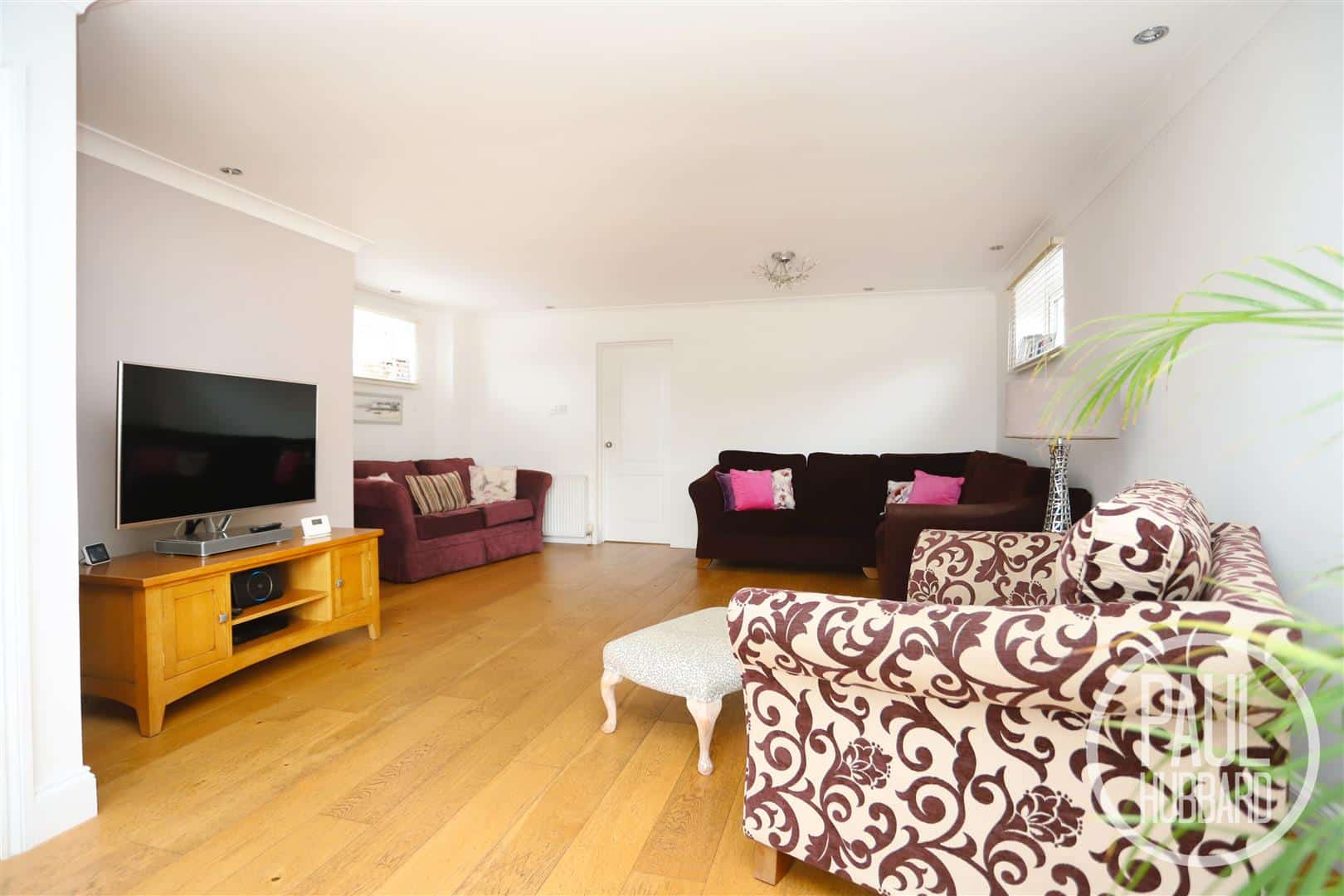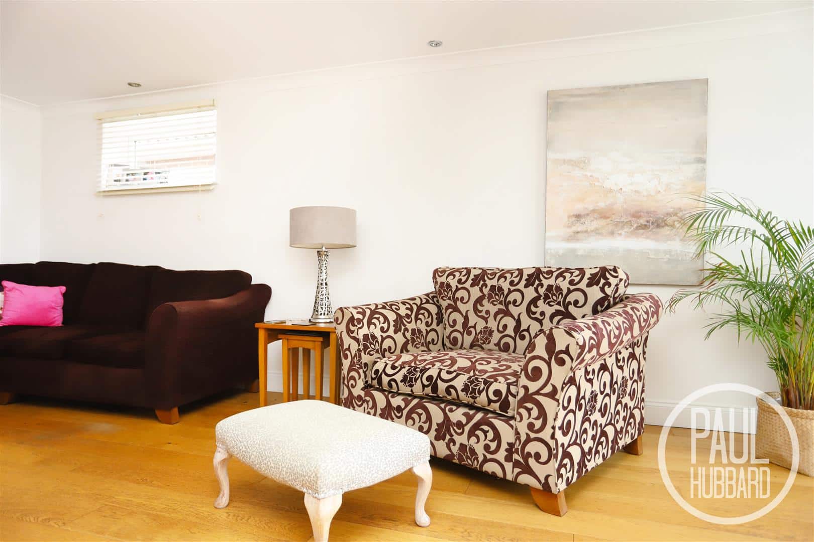 A spacious & bright sitting room featuring, engineered oak flooring, x3 dual aspect UPVC double glazed windows, x2 radiators, spotlights, under-stair storage cupboard and a door opening into the lobby.