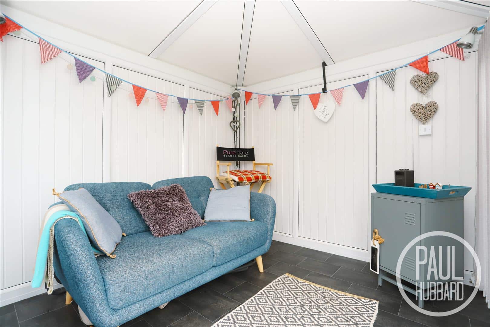 The garden studio is UPVC double glazed and finished with vinyl flooring. It offers light and power sockets, spotlights, and x2 UPVC sliding doors opening to the front and side. The space is suitable for hobbies, entertaining, or home working.