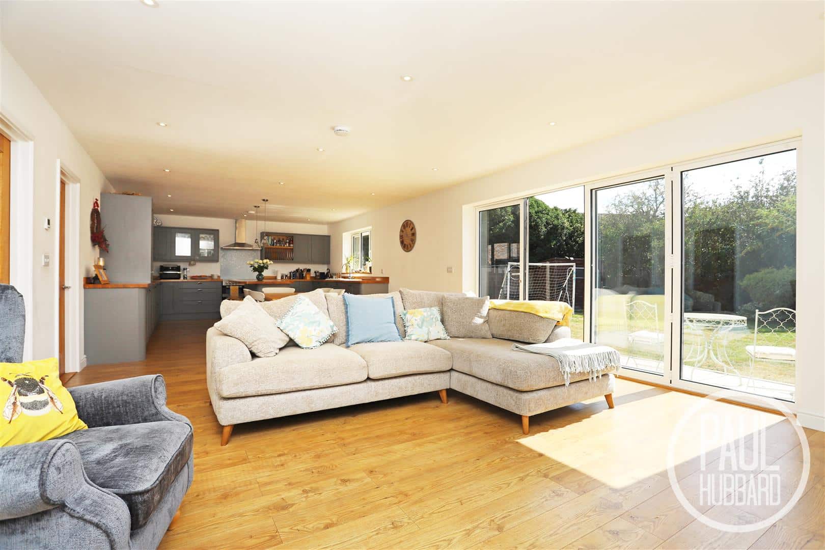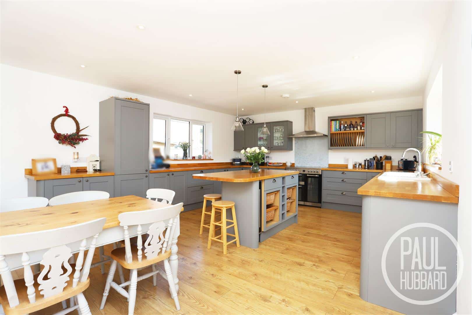 A stunning open-plan space designed for modern living, with a kitchen, dining area and lounge. Featuring laminate flooring, downlights, x3 UPVC double glazed windows to the front, side and rear, underfloor heating, units above and below, oak work surfaces, inset ceramic sink and drainer with mixer tap, space for a range master style oven, built-in stainless steel extractor hood, integrated fridge-freezer and dishwasher, central island with oak work surface, built-in baskets & units, integrated wine fridge, breakfast bar with space for stools and feature pendant lighting. A door opens into the utility room and bifold doors open out to the rear garden.