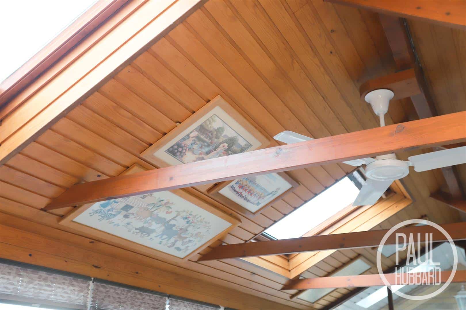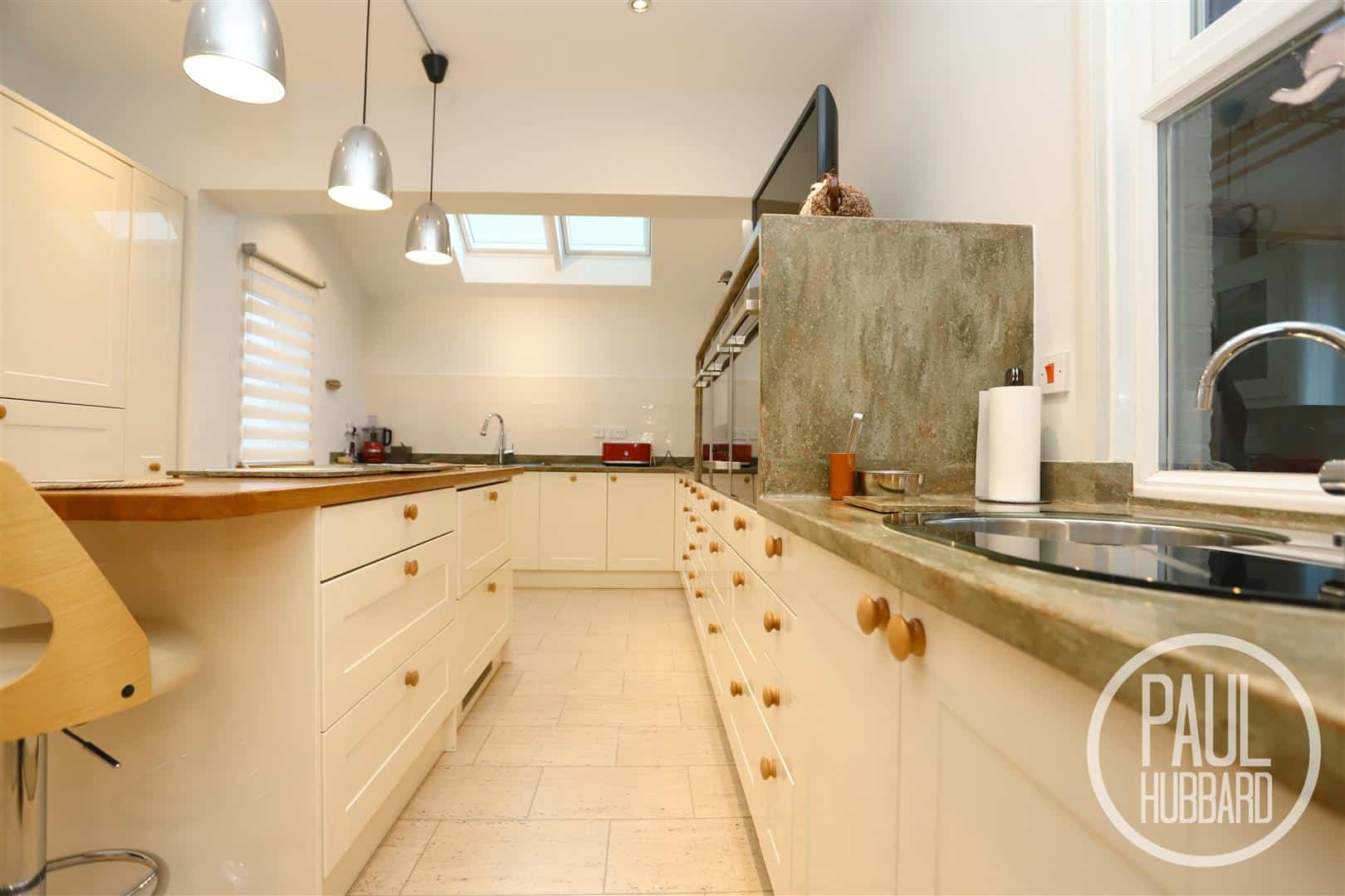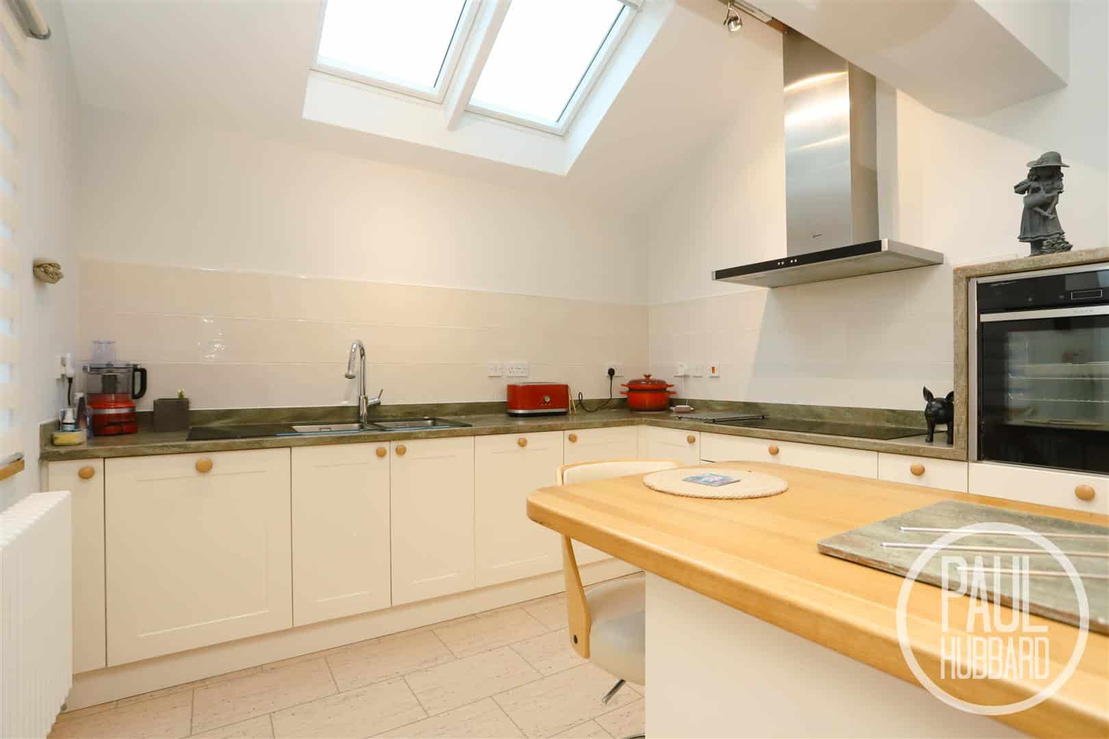 Stretching across the rear of the property, this room boasts abundant natural light and a unique panelled ceiling with feature beams. UPVC double glazed French doors open onto the garden, complemented by dual-aspect windows, while an additional side door leads to a passage connecting to the garage and providing driveway access through a roller door. The room also features three Velux windows, two radiators, tile flooring throughout, and an opening to the utility area.