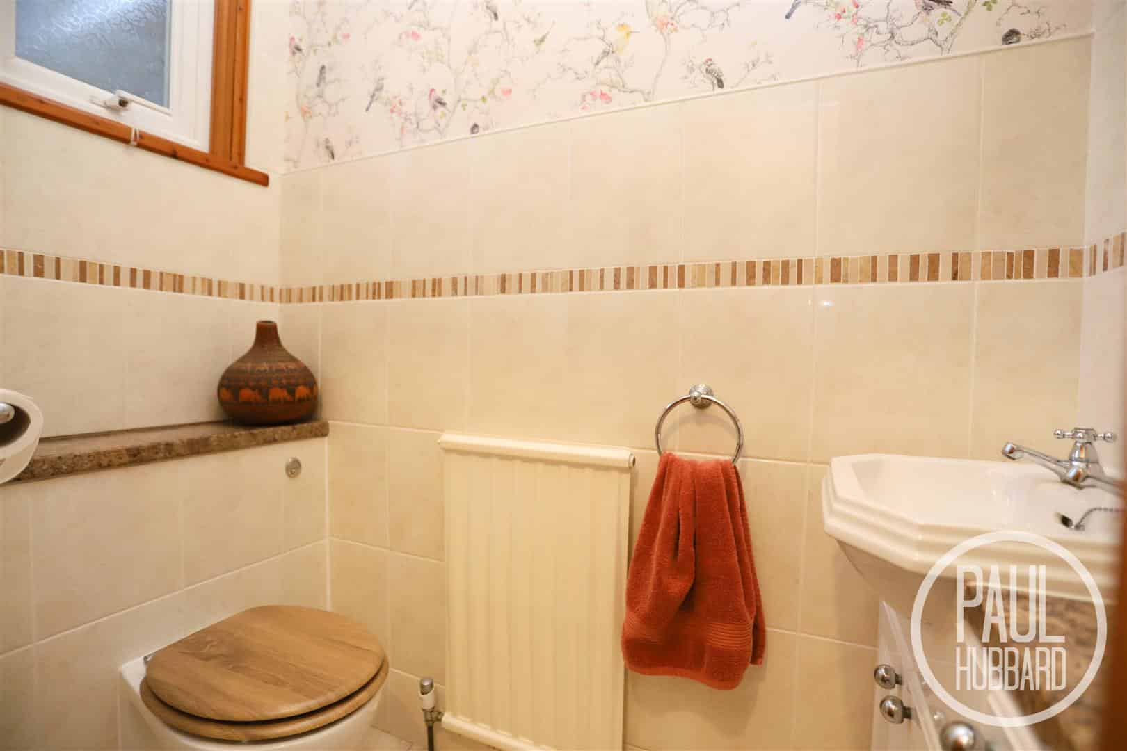 Tile flooring throughout, part-tile walls, UPVC double glazed window, radiator, toilet with hidden cistern and hand wash basin with built in cupboards below.