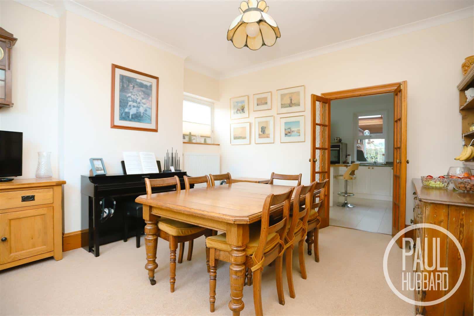 Carpet flooring throughout, radiator, feature dado rail, stairs leading to the first floor landing, original Victorian doors throughout opening to the sitting room, dining room, study, WC, under-stair storage cupboard, garden room and kitchen/breakfast room.