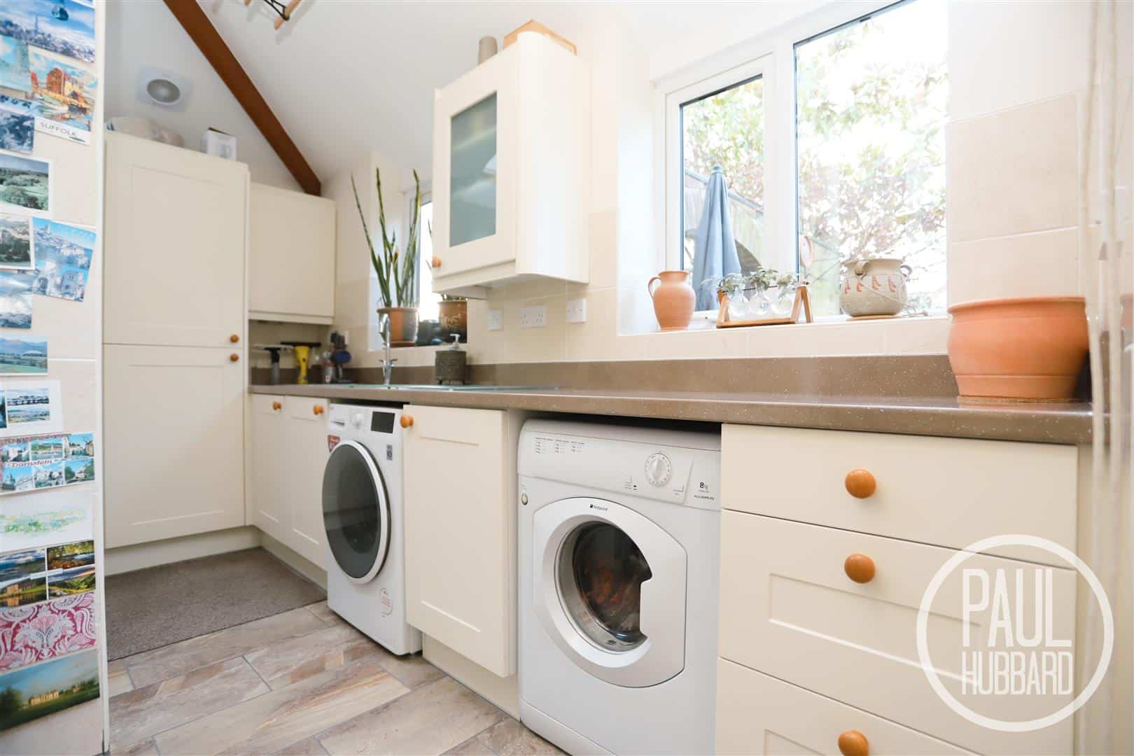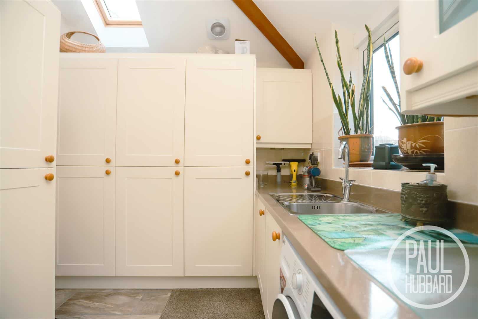 UPVC double glazed windows, Velux window, tile flooring throughout, floor standing gas boiler, Victorian laundry rack, tile splash backs, vertical radiator, a selection of units, laminate work surfaces with stainless steel sink with drainer and space below for a washing machine and tumble dryer.
