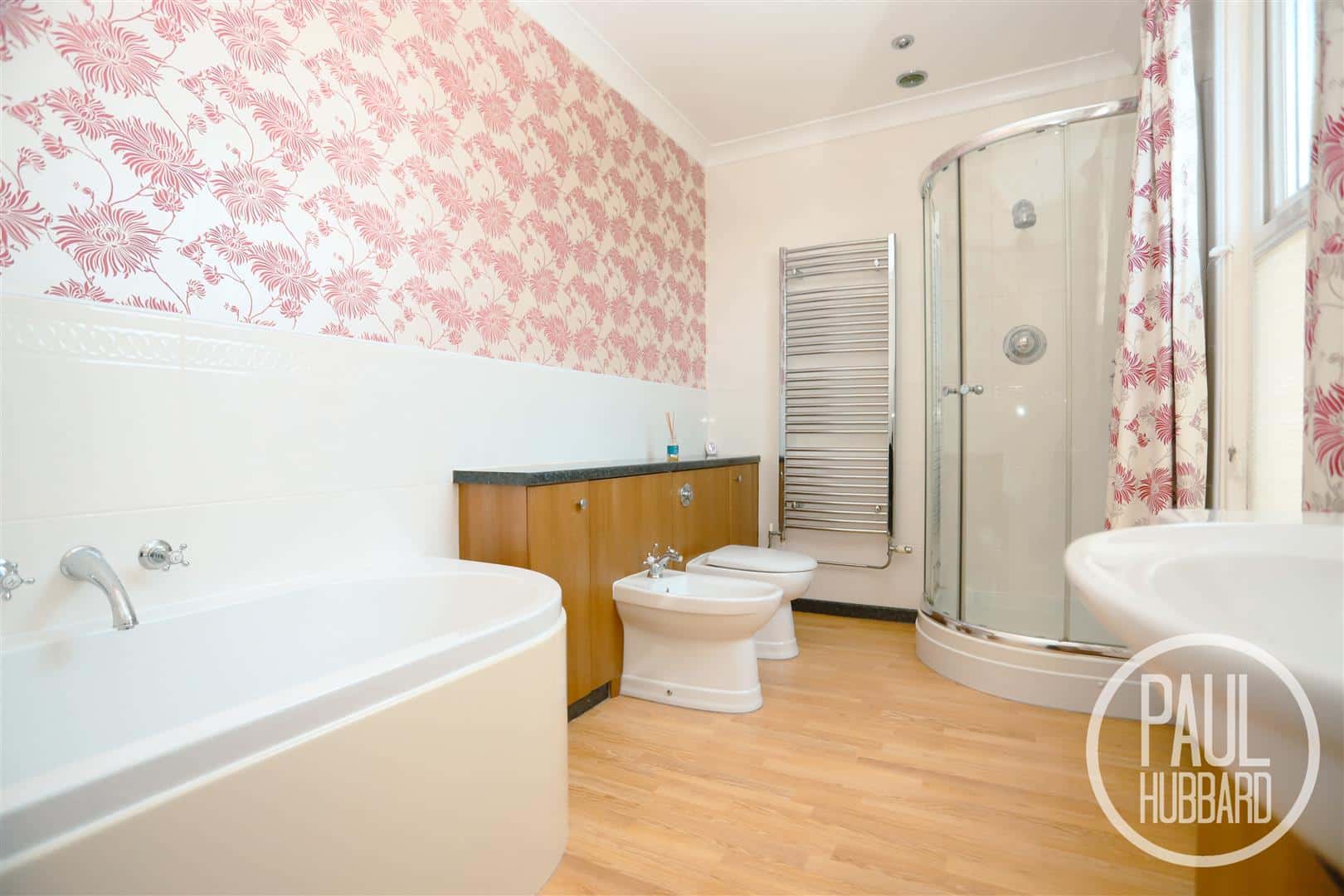 Wood-effect laminate flooring throughout, a UPVC double-glazed window, part-tiled walls, a radiator, a bath, a hand-wash basin with storage beneath, a heated towel rail, a base unit with a bidet and a toilet featuring a hidden cistern, and a shower enclosed within a glass cubicle.