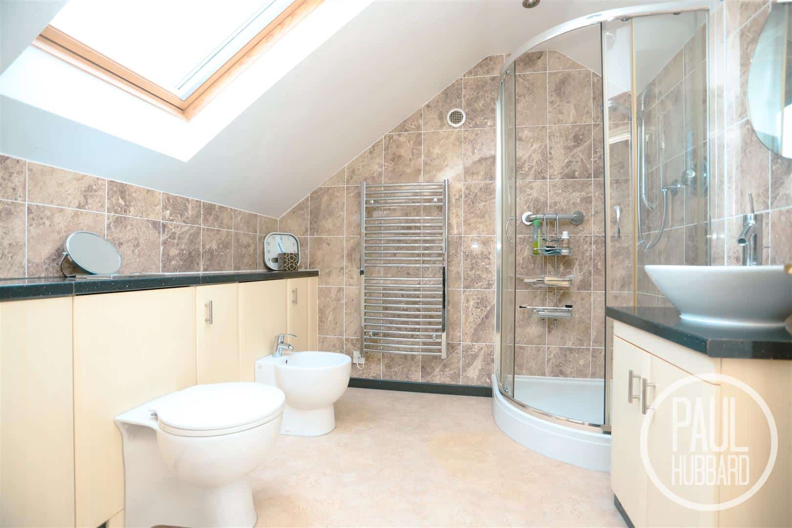 Vinyl flooring throughout, a Velux window, tiled walls, a radiator, a heated towel rail, a shower enclosed within a glass cubicle, a hand-wash basin with storage below and to the side, and additional base units with a toilet featuring a hidden cistern and a bidet.