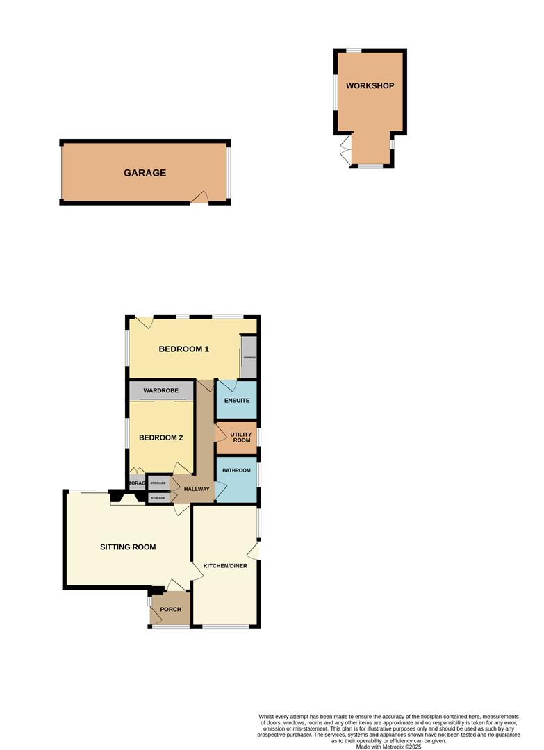 The detached garage is equipped with an electric roller door, offering versatile space for parking or storage, and includes lighting, power sockets, a window and a convenient pedestrian side door.