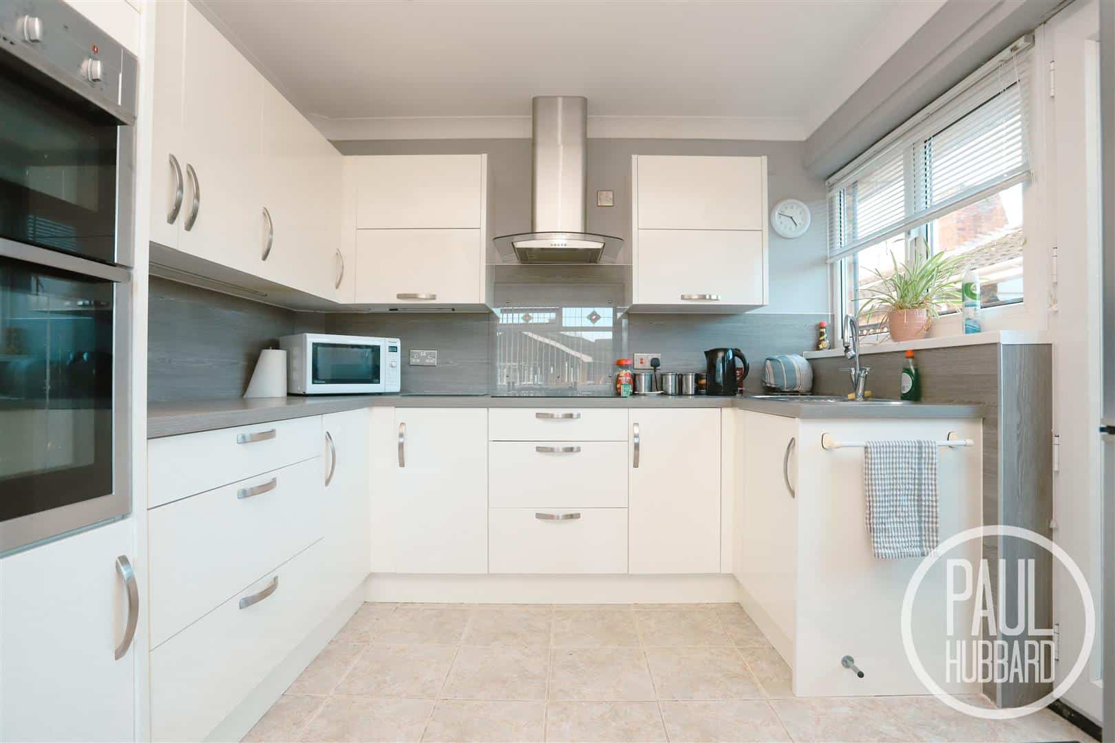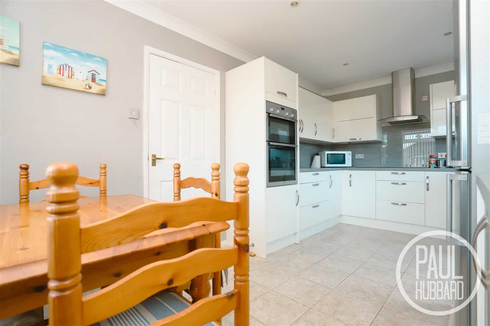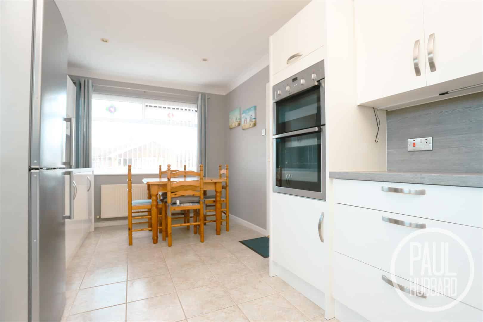 Tile flooring, dual aspect UPVC double glazed windows, spotlights, radiator, units above & below, laminate work surfaces, laminate splash backs, inset stainless steel sink & drainer with mixer tap, ceramic hob, stainless steel extractor fan, built-in double oven, space for a fridge-freezer & dining table and a UPVC door opens to the side exterior.