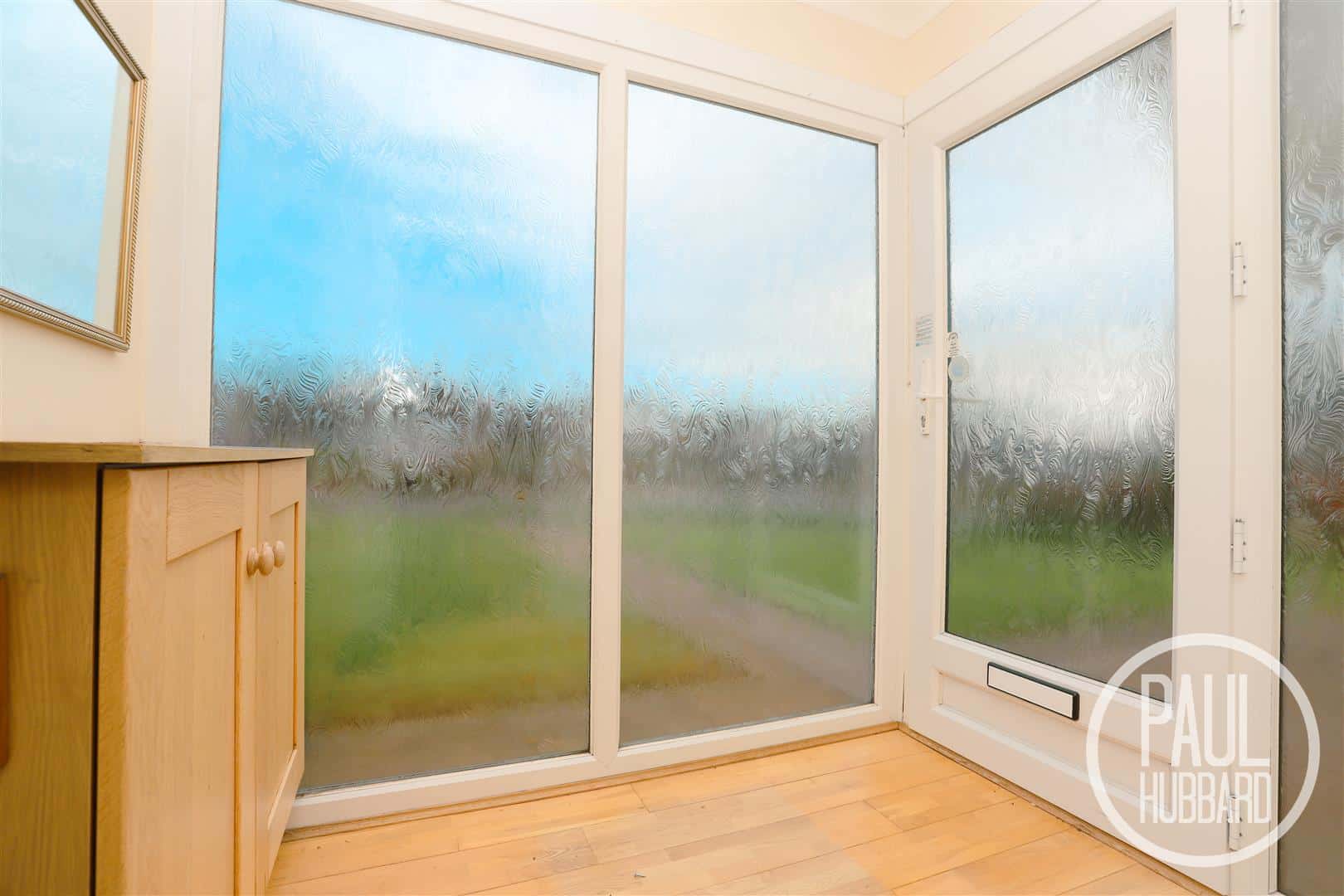 UPVC entrance door to the side, dual aspect UPVC double glazed obscure windows, wood flooring, space for storing coats & shoes, radiator and a door opens into the sitting room.
