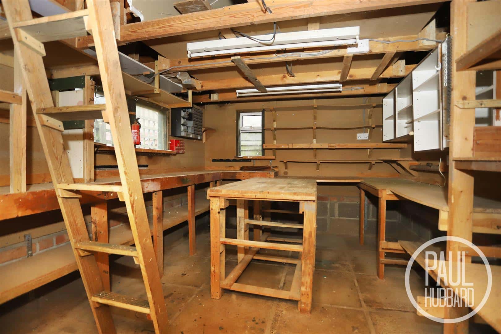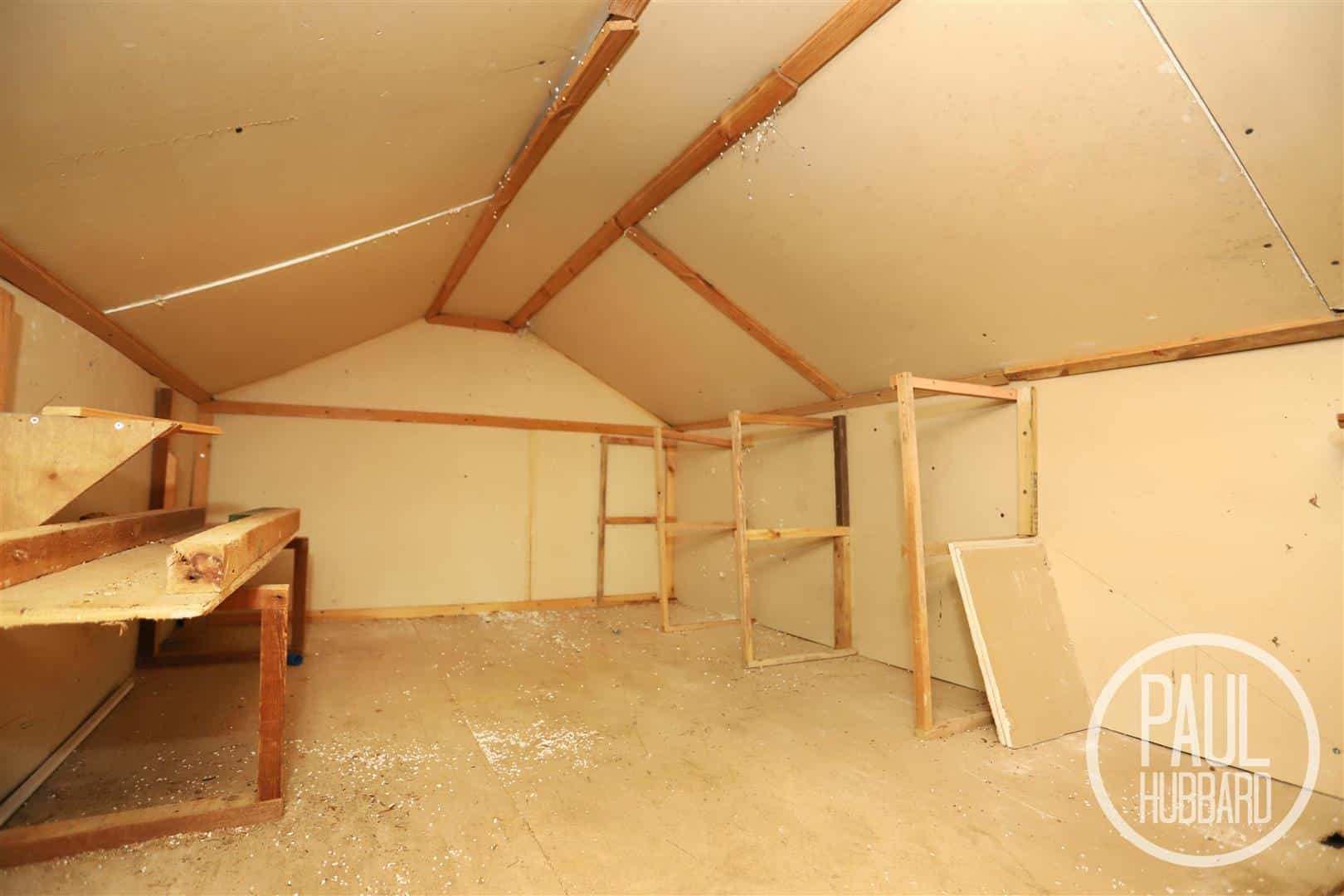 A substantial workshop providing excellent space for hobbies, storage or projects, complete with lighting, power sockets, a window, and a ladder leading to a fully boarded mezzanine level for additional storage.