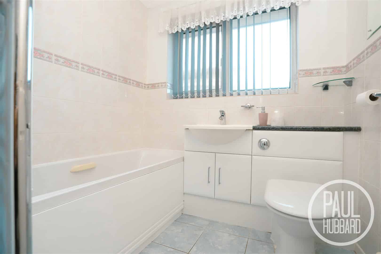 Tile flooring, UPVC double glazed obscure window to the side aspect, spotlights, extractor fan, heated towel rail, radiator, part-tiled walls, toilet & wash basin set into a vanity unit with a mixer tap and a panelled bath with hot & cold taps plus a mains-fed shower set above.