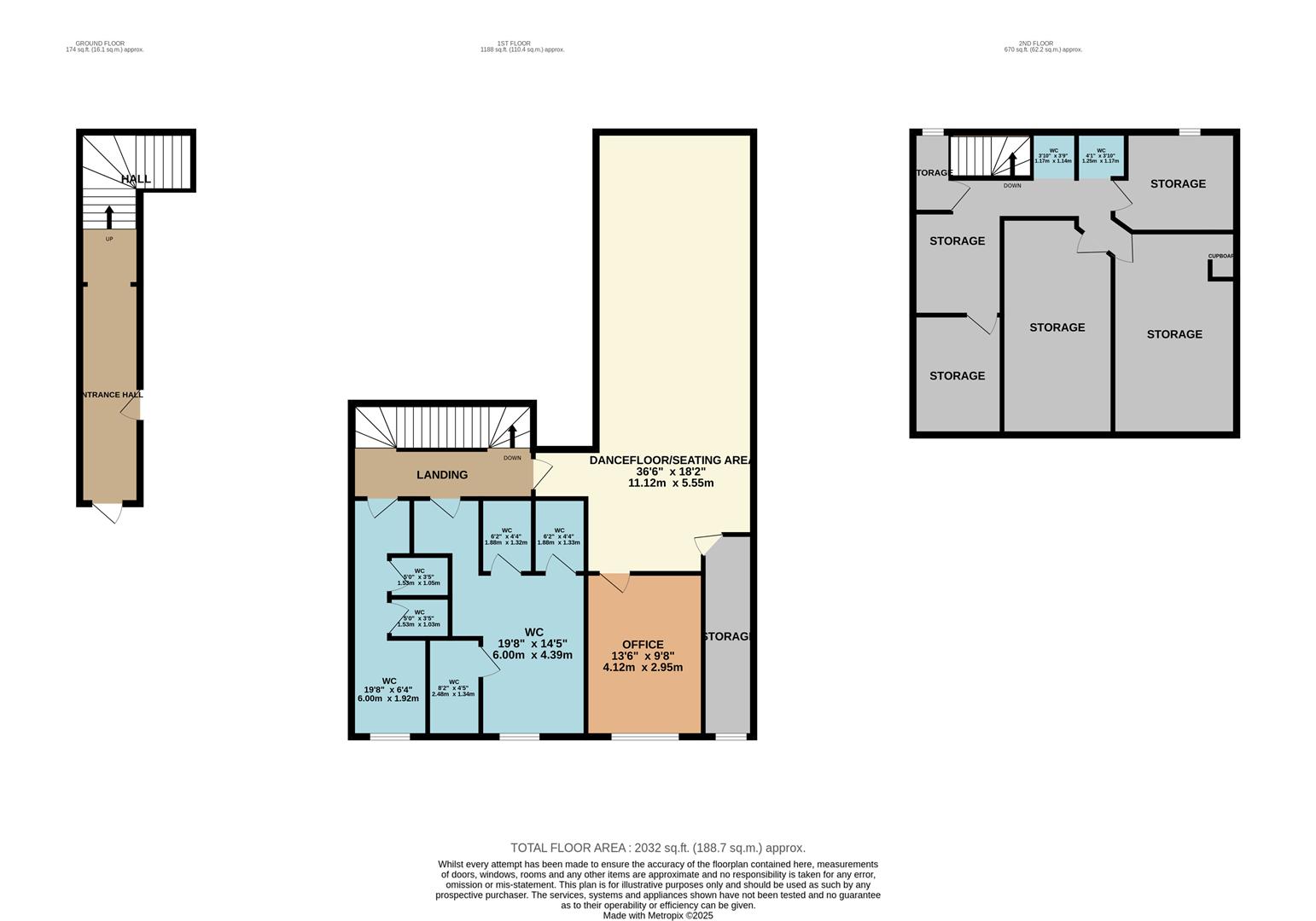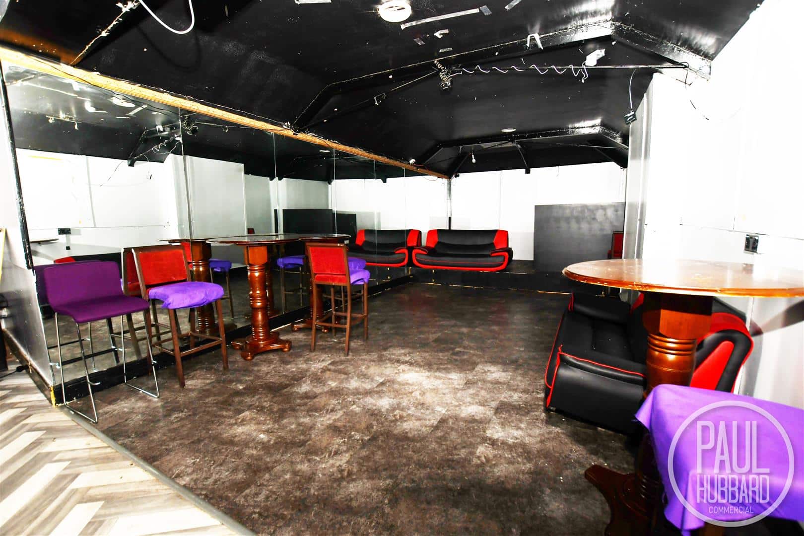 Formerly the upper levels of a nightclub, the first floor comprises a generous open-plan area with a dance floor and bar, spacious male and female WCs, an office, and additional storage. The second floor provides a mix of rooms that, once refurbished, could be sub-let as individual offices or repurposed as further storage or operational space.