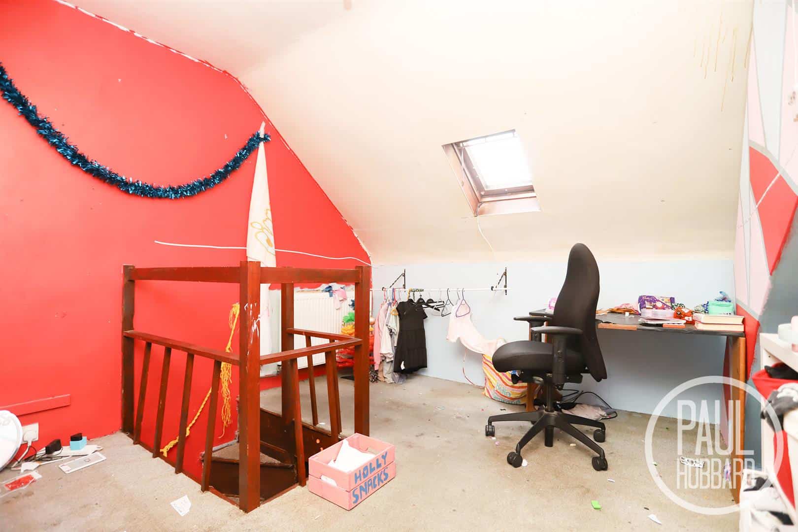 Fitted carpet, timber frame Velux window and a radiator.