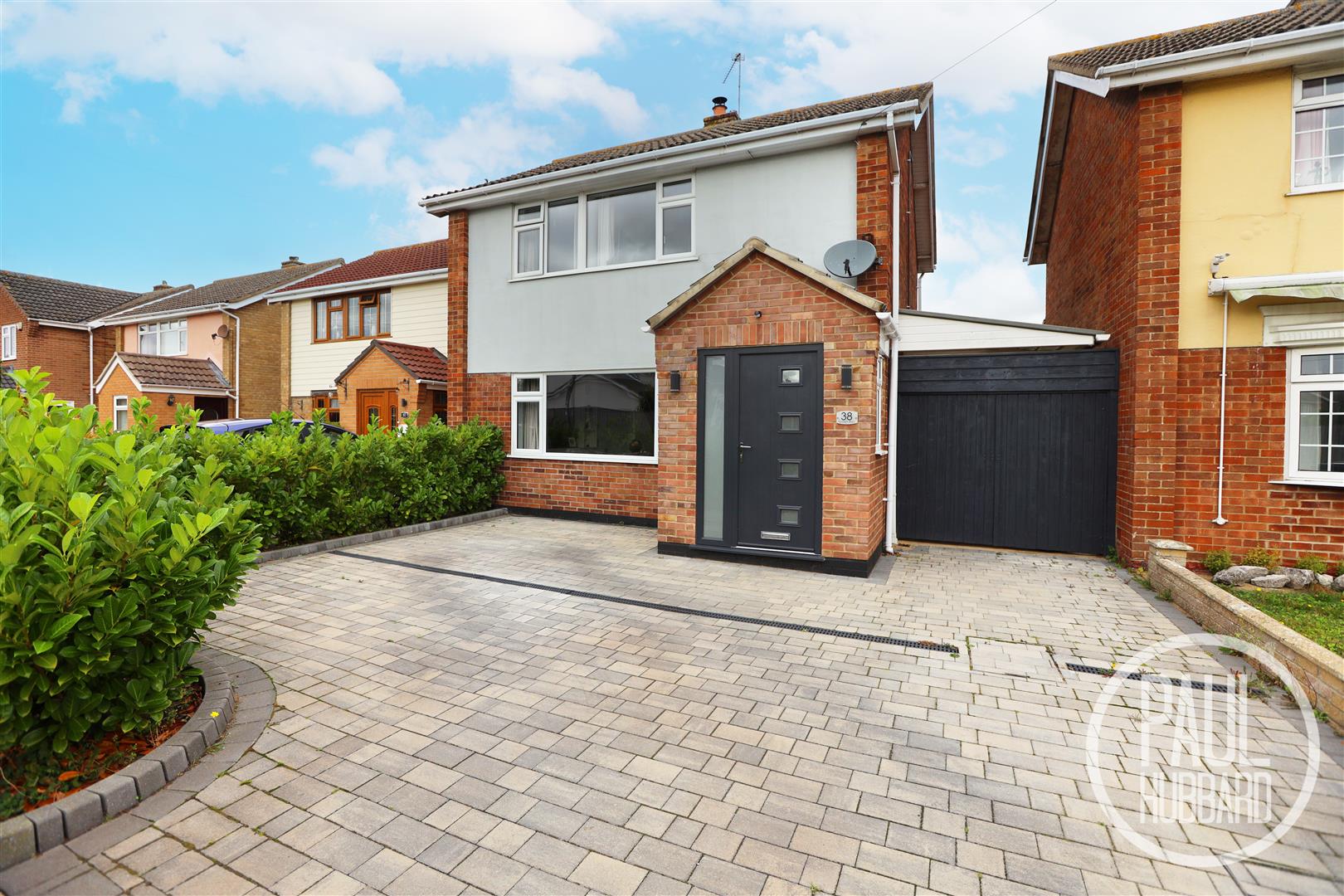 To the front the property offers a spacious driveway providing off-road parking, double gated access to the rear, attractive flower beds, and outdoor lighting, combining convenience with kerb appeal.