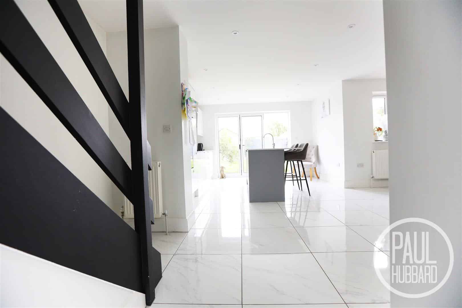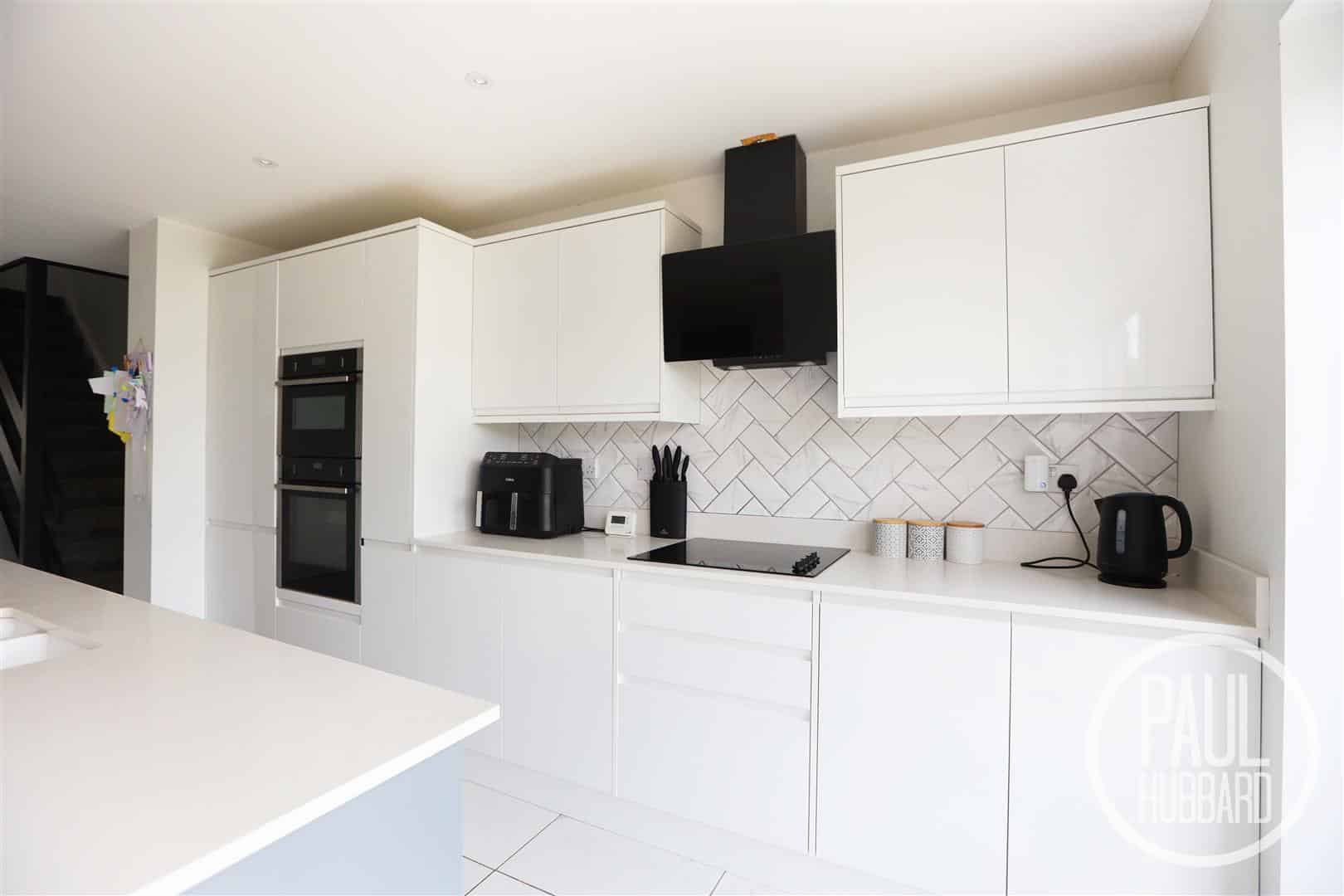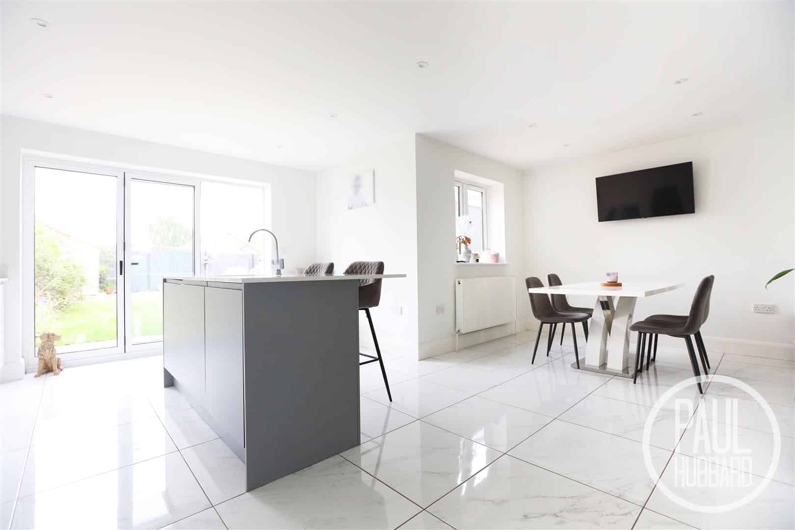 UPVC double glazed window to the rear aspect, tiled flooring throughout, a storage cupboard, X2 radiators, units above and below, integrated hob, extractor fan, double oven, fridge/ freezer, dishwasher and a washing machine, island with inset sink with drainer, breakfast bar, stairs leading to the first floor landing and doors opening to the sitting room, cloakroom, storage cupboard and bi-folding doors opening to the rear garden.