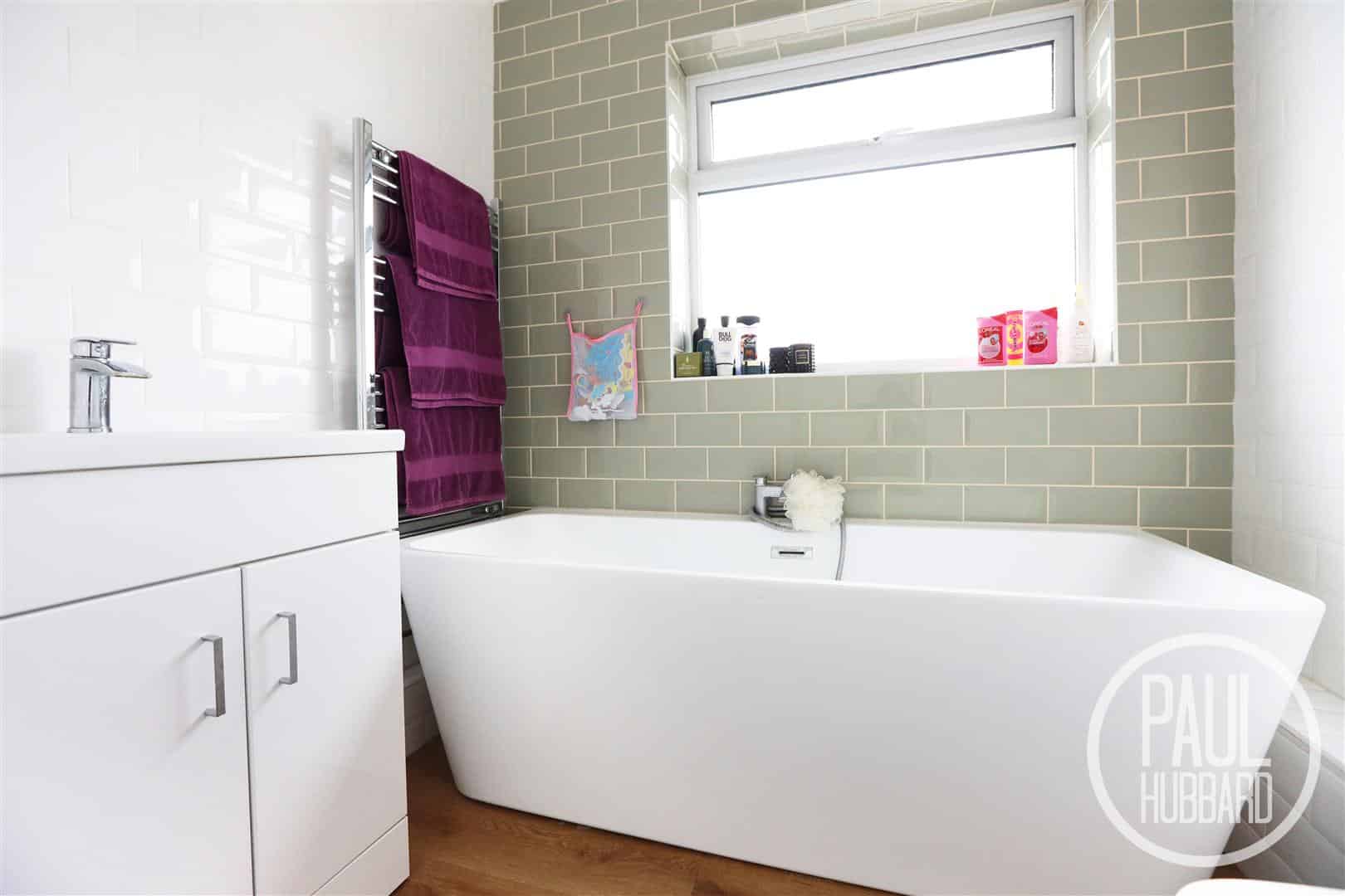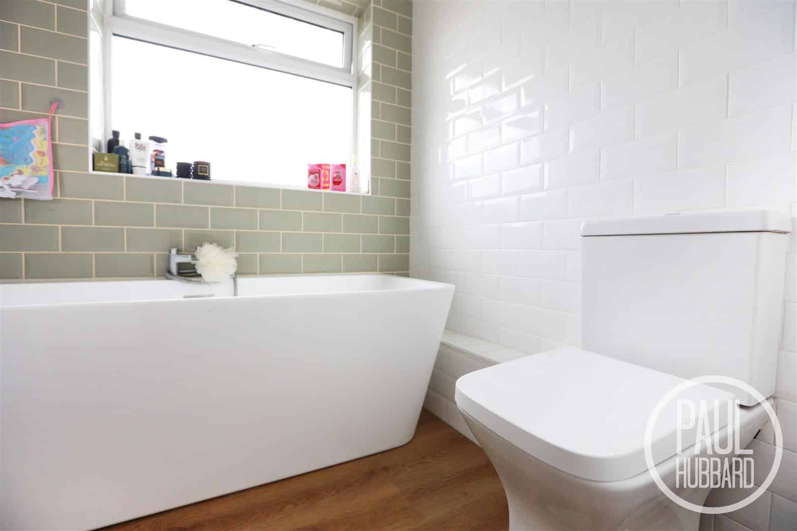 UPVC double glazed obscure window to the rear aspect, laminate flooring throughout, tiled walls, toilet, vanity unit with inset sink, bath with shower attachment and a heated towel rail.