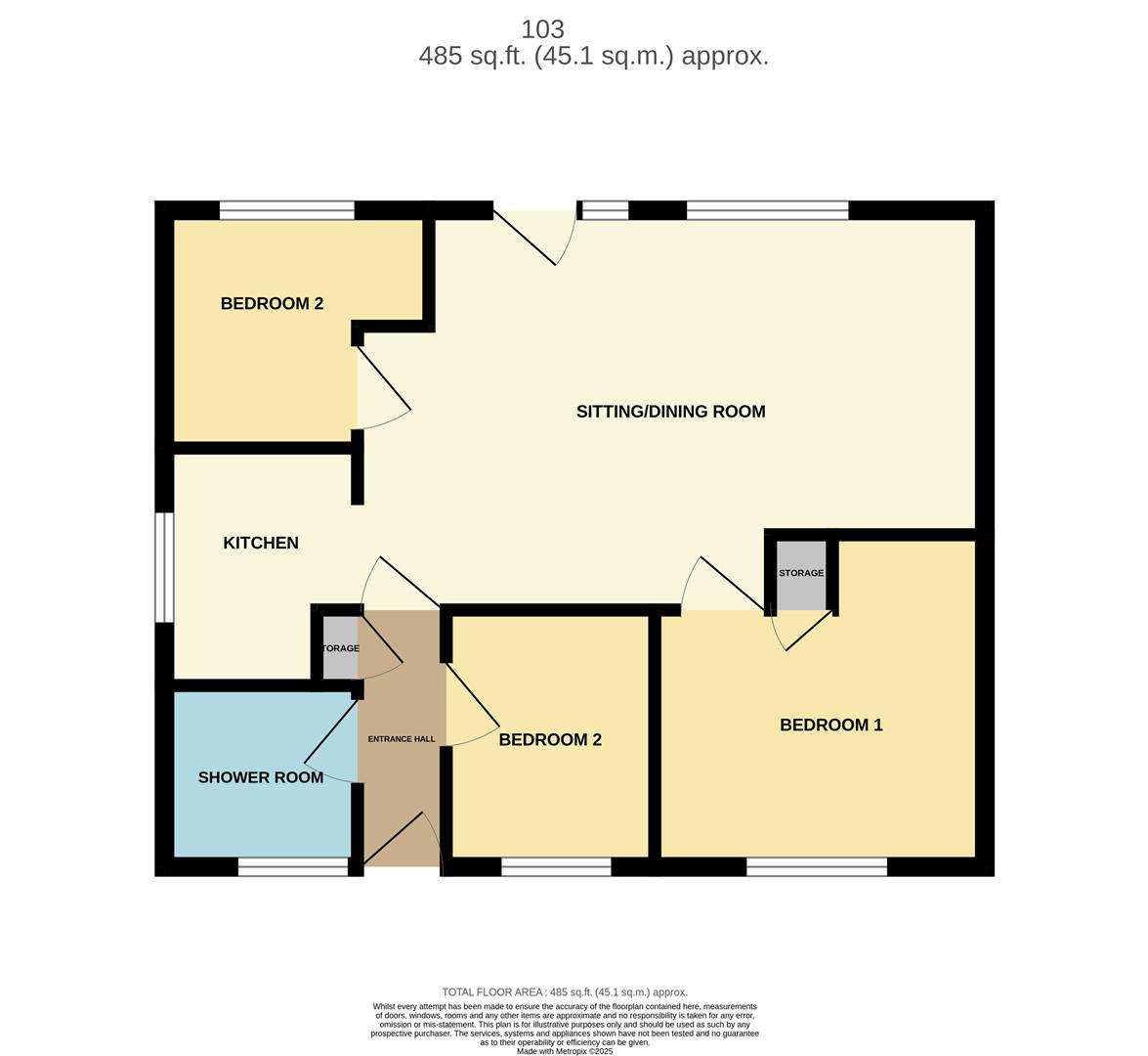 Entrance door to the front aspect, laminate flooring throughout and doors opening to the shower room, storage cupboard, bedroom 2 and the sitting/ dining room.