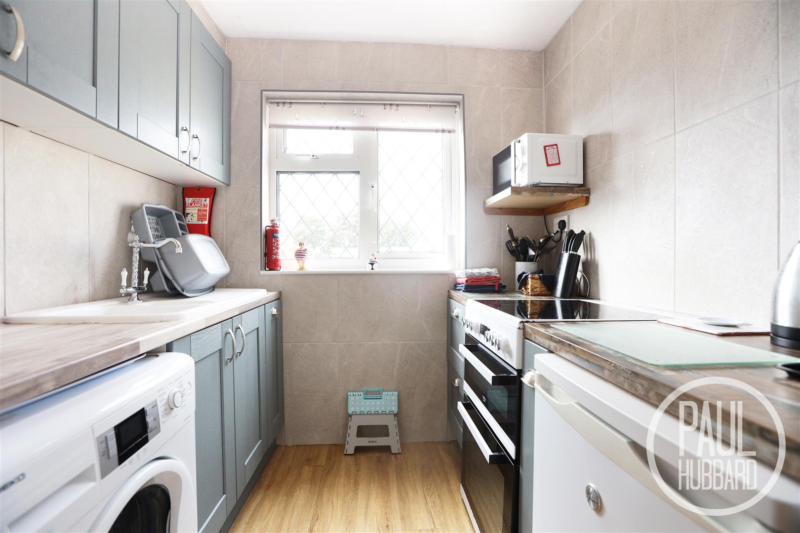 UPVC double glazed window to the side aspect, vinyl flooring throughout, tiled walls, units above and below, sink with drainer, spaces for an oven, fridge/freezer and a washing machine.