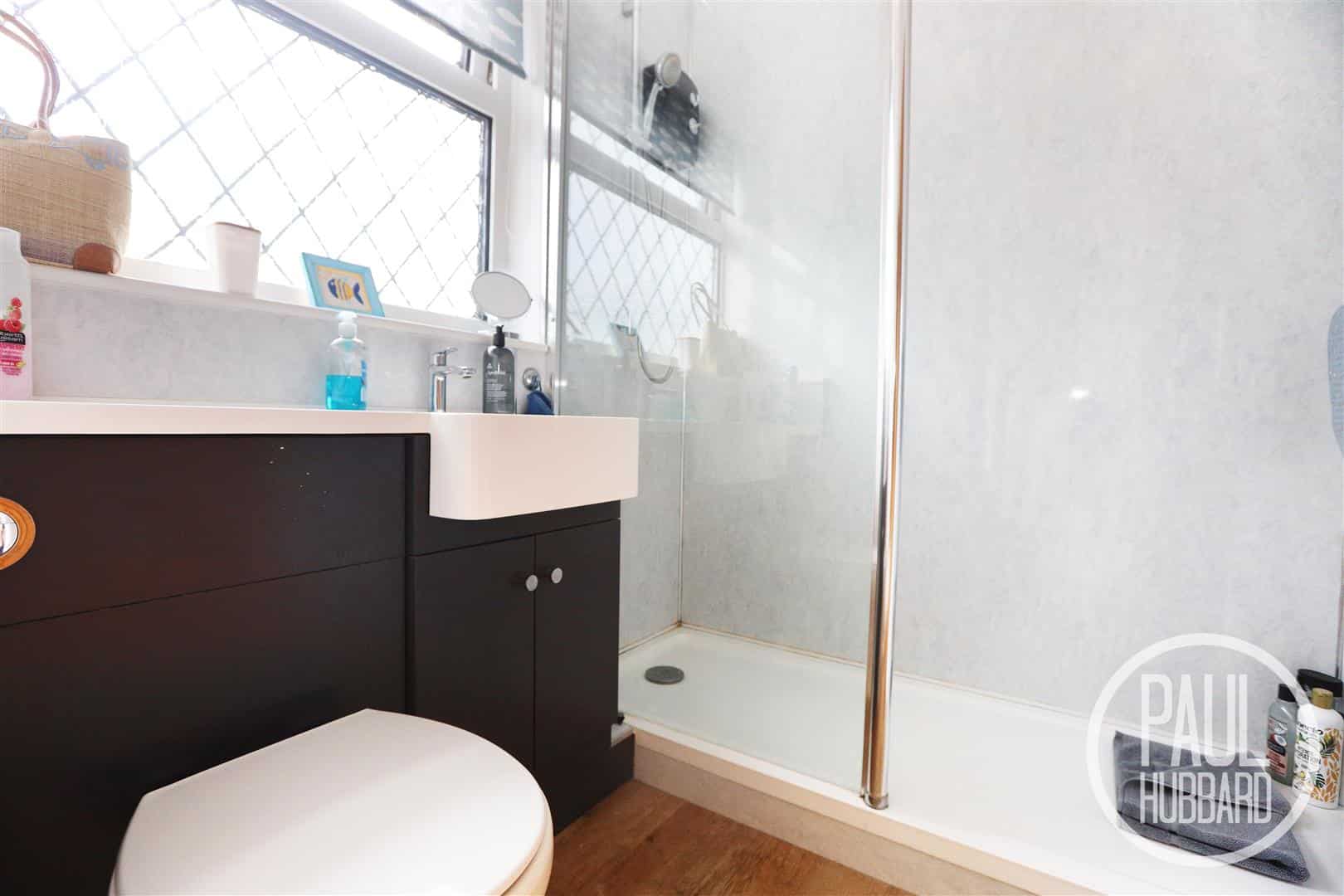 UPVC double glazed obscure window to the front aspect, vinyl flooring throughout, aqua board, shower within a glass cubicle, vanity unit with inset sink and toilet and a towel rail.