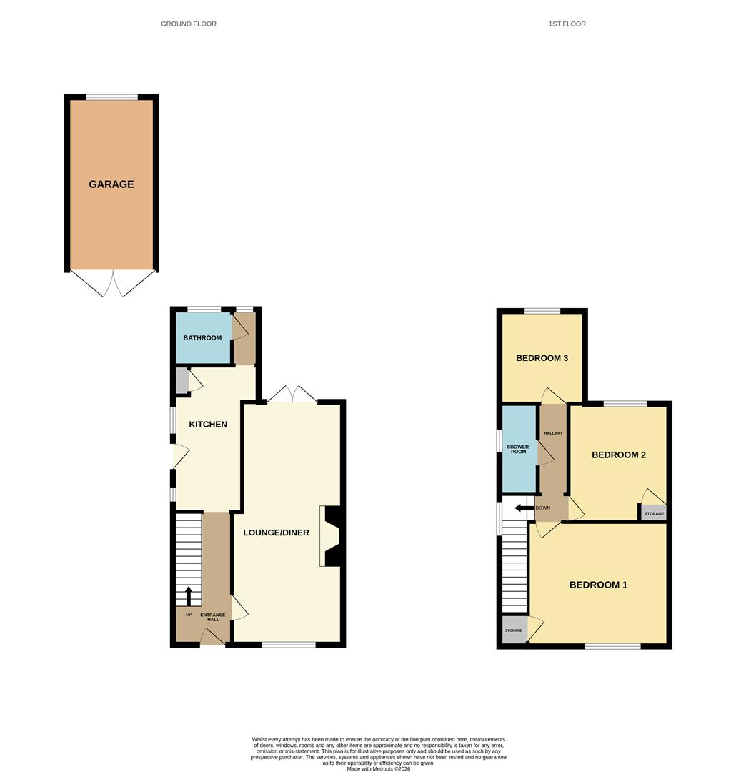 A detached garage with double doors to the front and a timber-framed window to the rear, providing excellent additional storage or potential workshop space.
