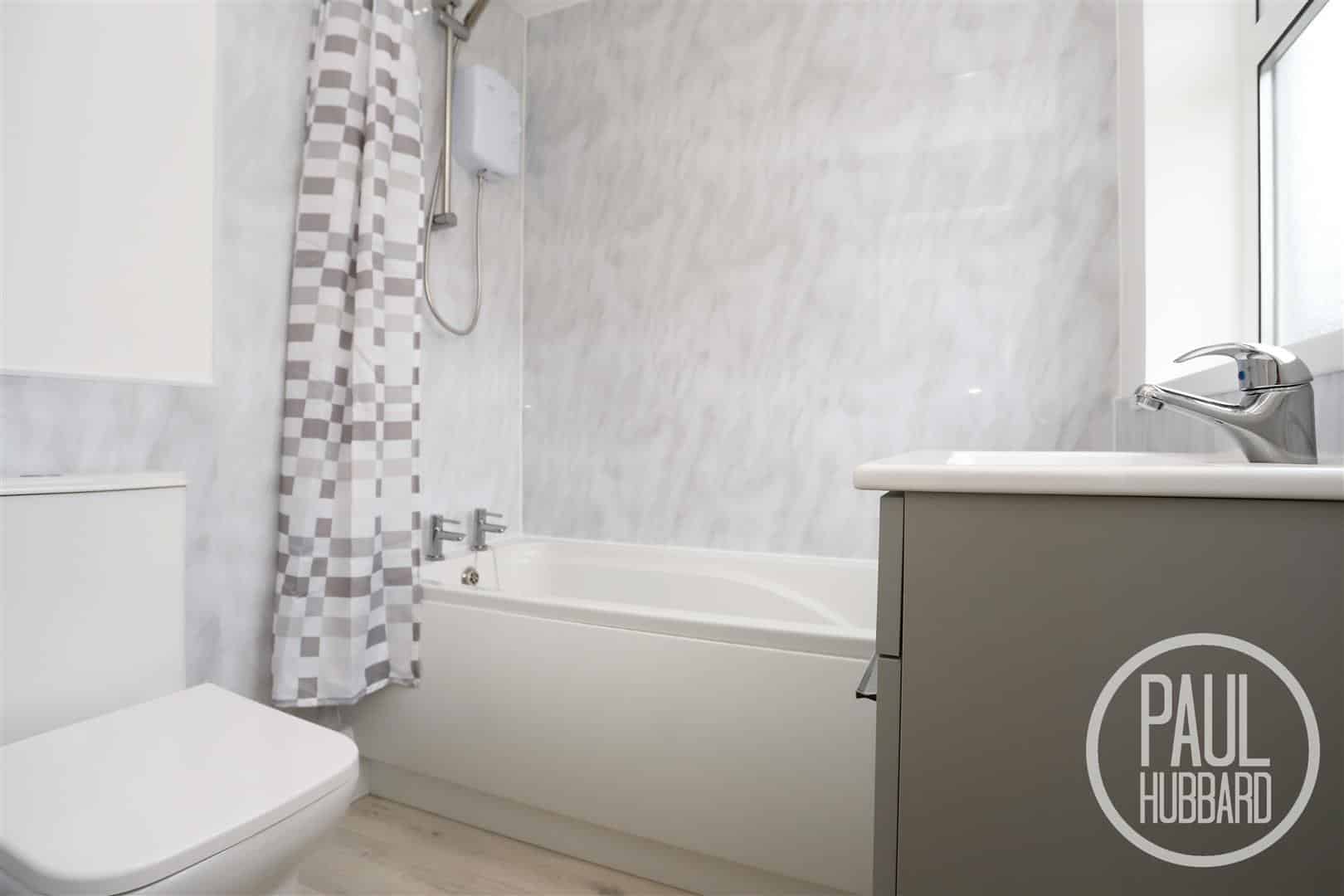Vinyl flooring, UPVC double glazed obscure window to the rear aspect, extractor fan, radiator, toilet, wash basin set into a vanity unit with a mixer tap, a panelled bath with hot & cold taps & an electric shower set above and aqua board wall panels.