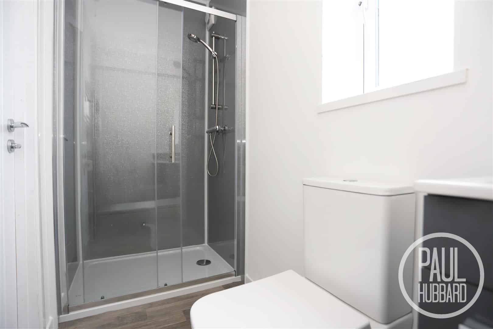LVT flooring, UPVC double glazed obscure window to the side aspect, extractor fan, heated towel rail, toilet, wash basin set into a vanity into with a mixer tap, a mains-fed shower set into a large cubicle enclosure and aqua board wall panel splash backs.