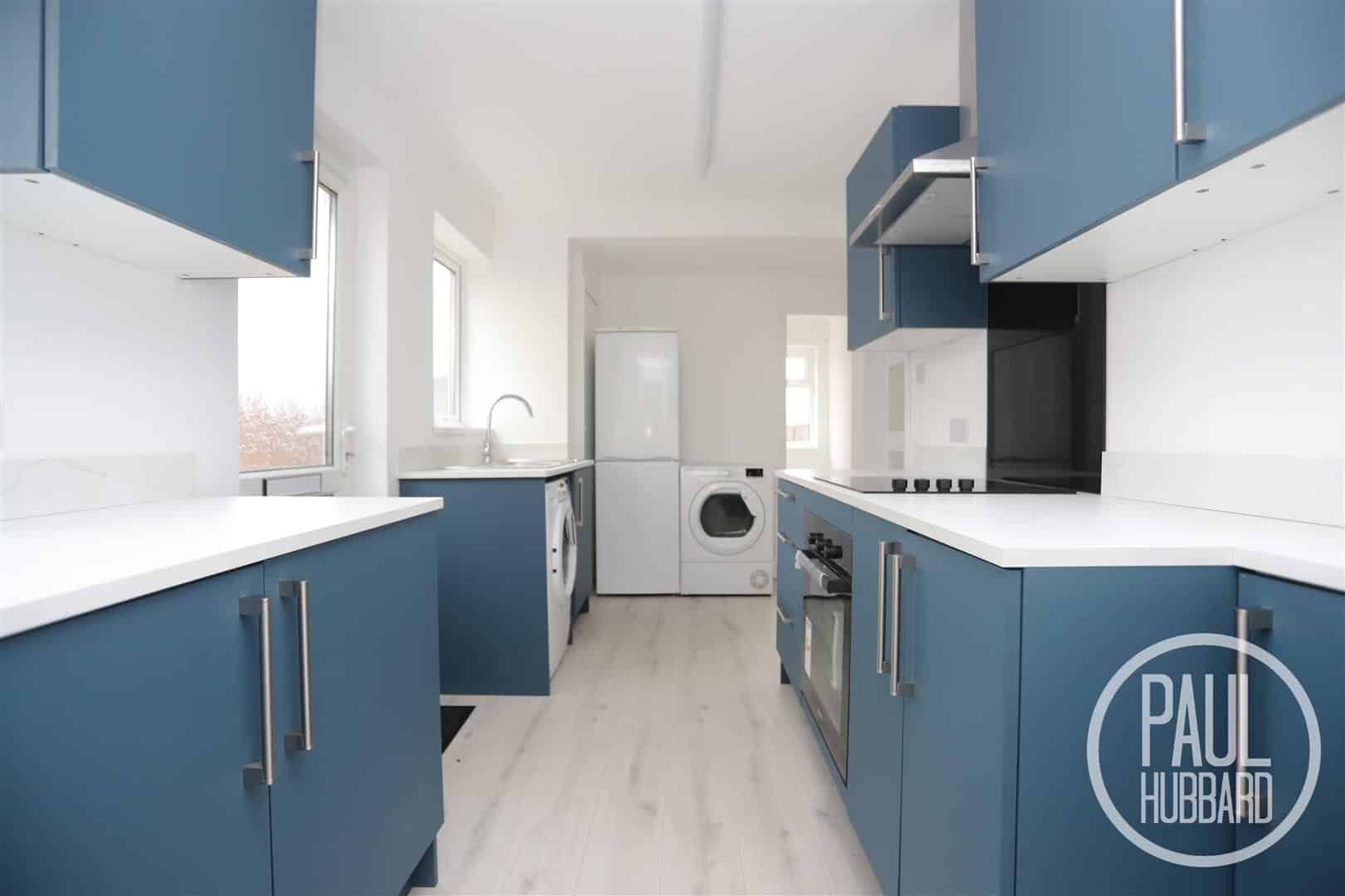 Laminate flooring, x2 UPVC double glazed windows to the side aspect, built-in storage cupboard, units above & below, laminate work surfaces, inset stainless steel sink & drainer with mixer tap, built-in oven, ceramic hob & stainless steel extractor fan, heated towel rail, space for a fridge-freezer & washing machine, a door opens to the exterior and an opening leads through to the rear lobby.