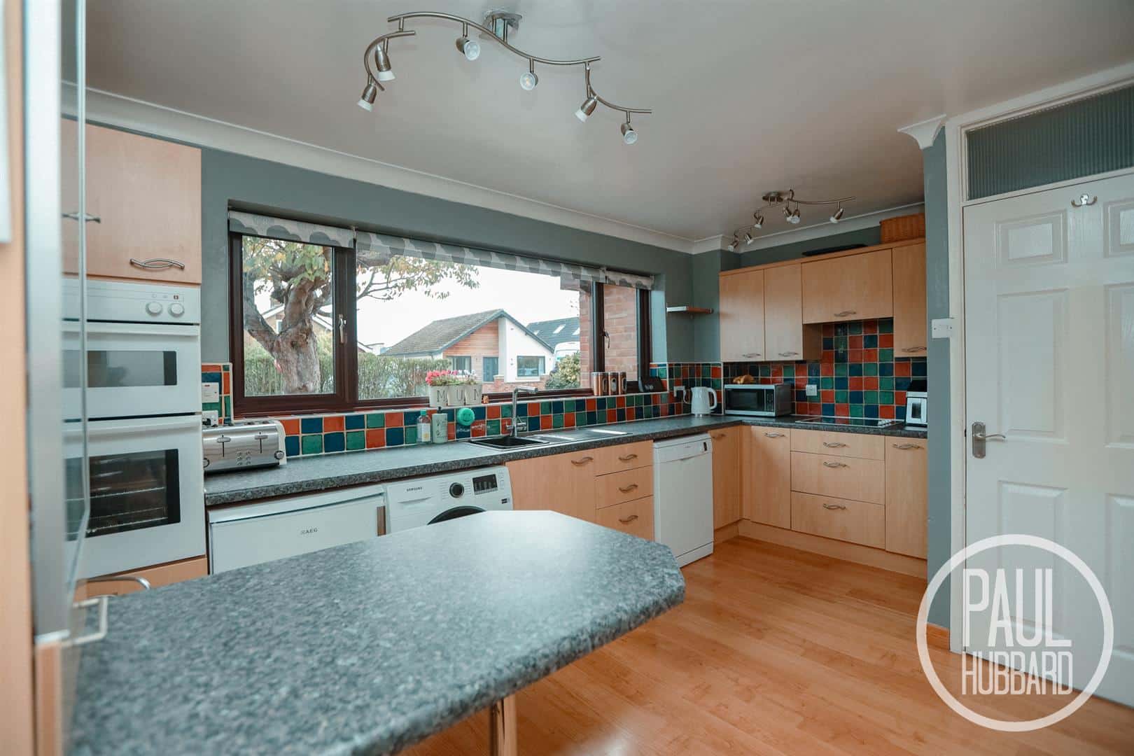 Laminate flooring throughout, UPVC double glazed window, radiator, units above and below, tile splash back, laminate work surfaces, stainless steel sink with drainer, ceramic hob, extractor fan, integral oven and grill, central breakfast bar, space for appliances including a washing machine, fridge and dishwasher. Doors opening to a built in pantry and storage cupboard housing the water tank.