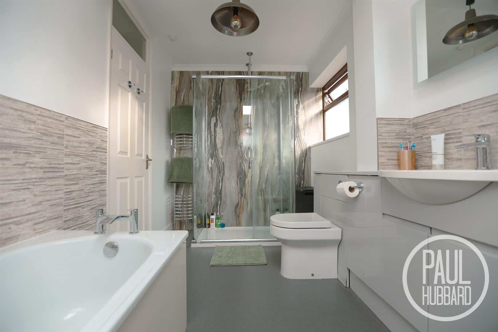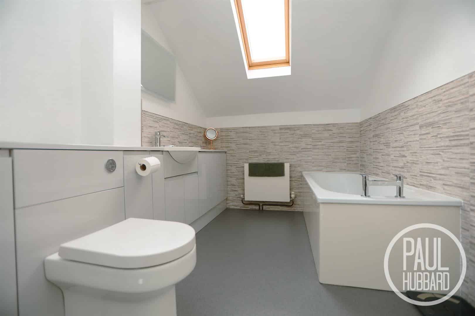 A sizeable modern suite with anti-slip wet room flooring, UPVC double glazed window, Velux, part tile splash backs, a bath, radiator, heated towel radiator, shower enclosed within a glass cubicle and feature panelling. A vanity unit with inset hand wash basin and toilet with hidden cistern. l.