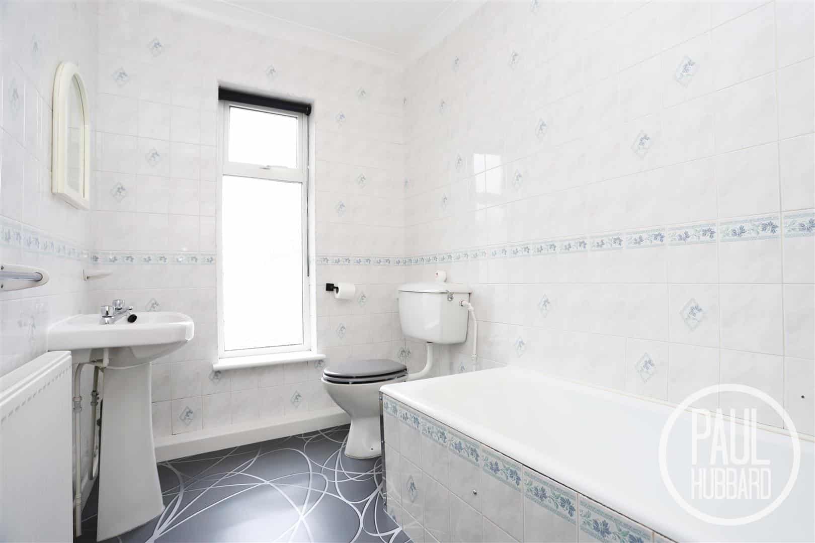 Vinyl flooring, radiator, UPVC double glazed obscure window to the rear aspect, toilet, pedestal wash basin with hot & cold taps, panelled bath with hot & cold taps, tiled walls and a fitted storage cupboard.