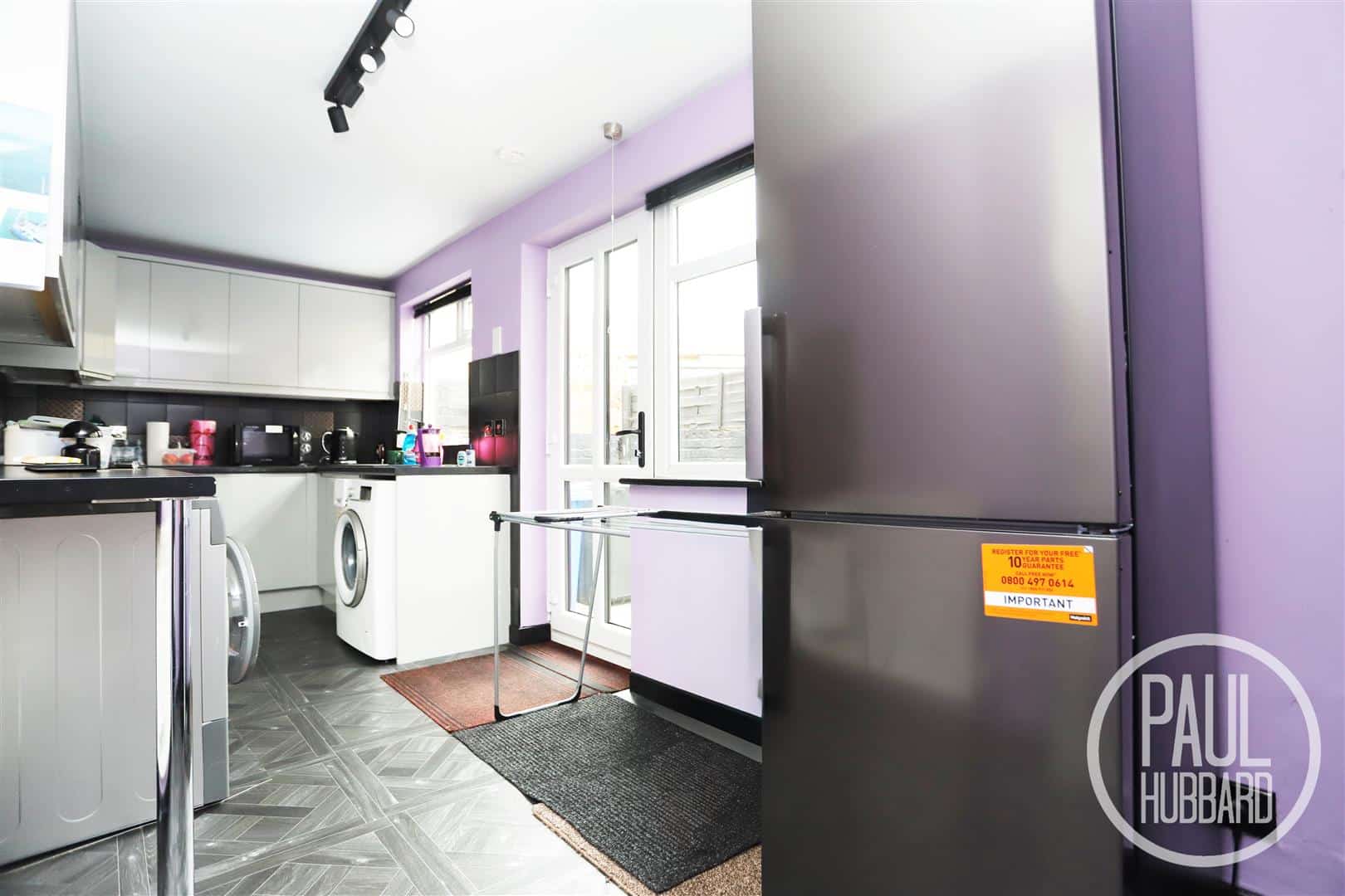 Vinyl flooring, x2 UPVC double glazed windows to the side aspect, radiator, units above & below, laminate work surfaces, tile splash backs, inset composite sink & drainer with mixer tap, spaces for a fridge-freezer, washing machine & dishwasher/ tumble dryer, built-in oven, ceramic hob & extractor hood and a UPVC door opens out to the courtyard.