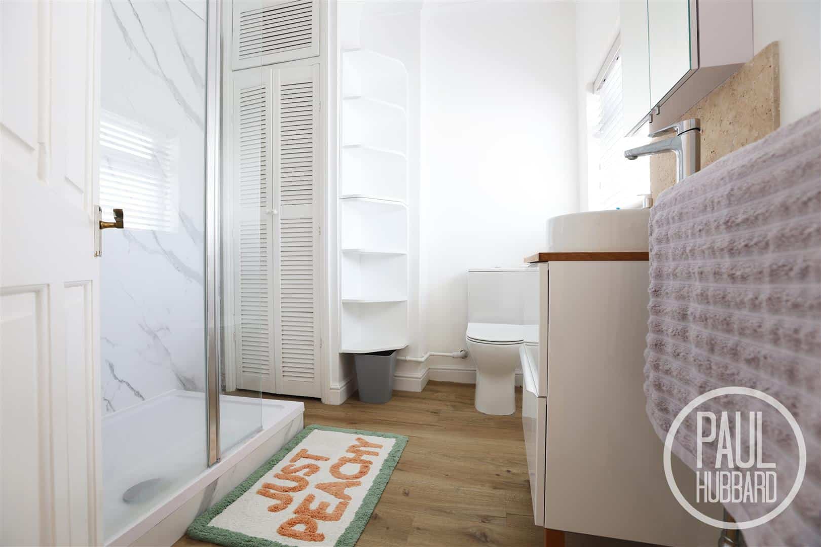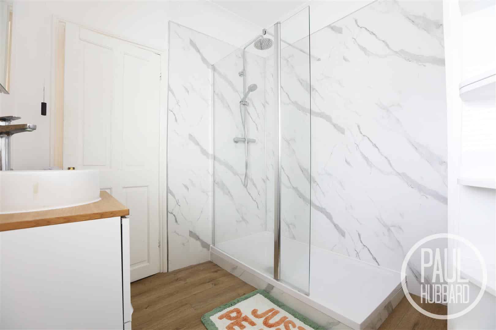 Vinyl flooring, UPVC double glazed obscure window to the rear aspect, radiator, built-in storage cupboard, toilet, pedestal wash basin with hot & cold taps, a walk-in shower with both handheld & rainfall heads and aqua board wall panels.
