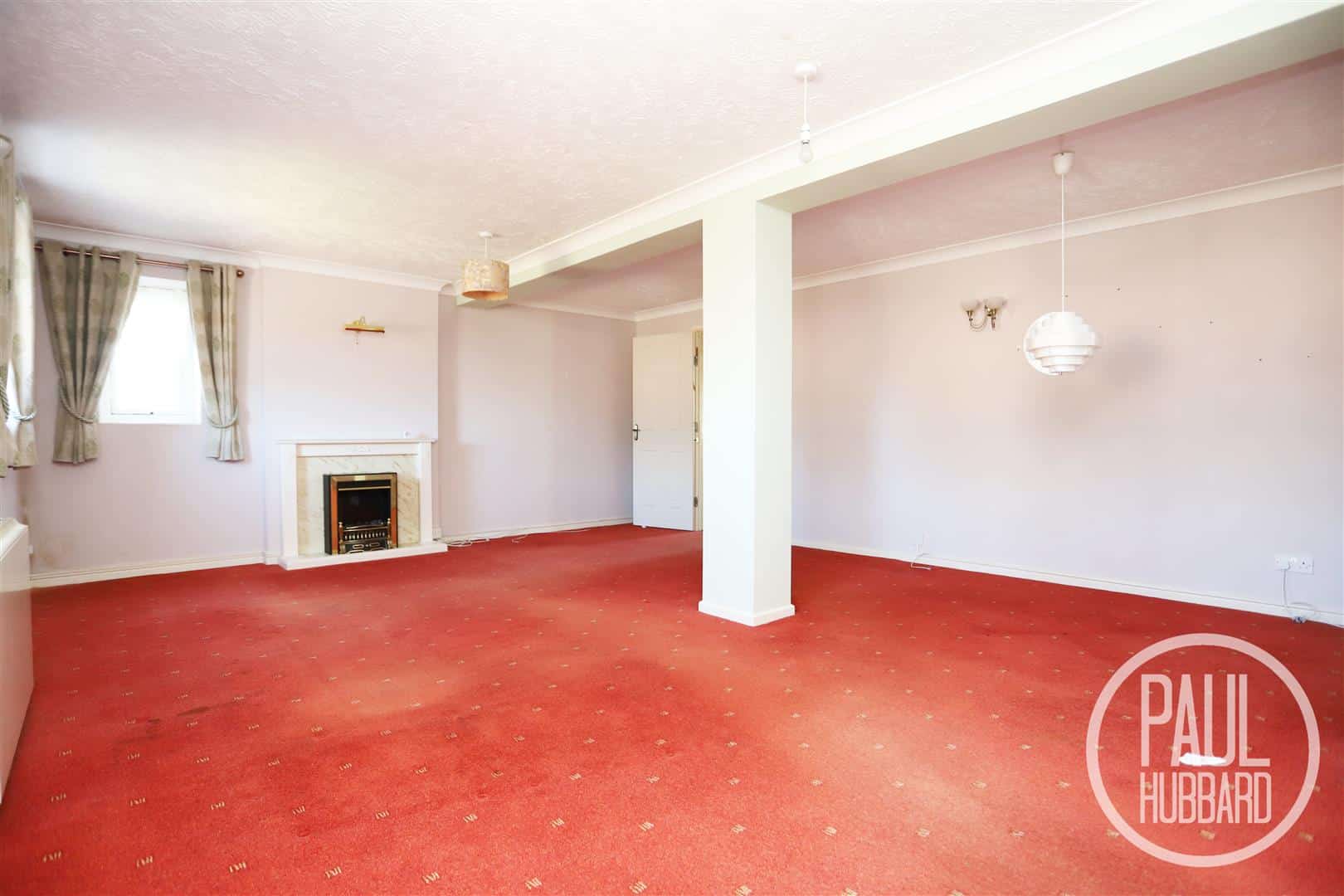 Fitted carpet, x3 UPVC double glazed windows with views of the broads, x2 storage heaters, fireplace and a door opening into the kitchen.