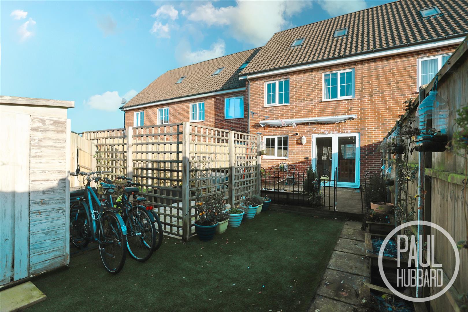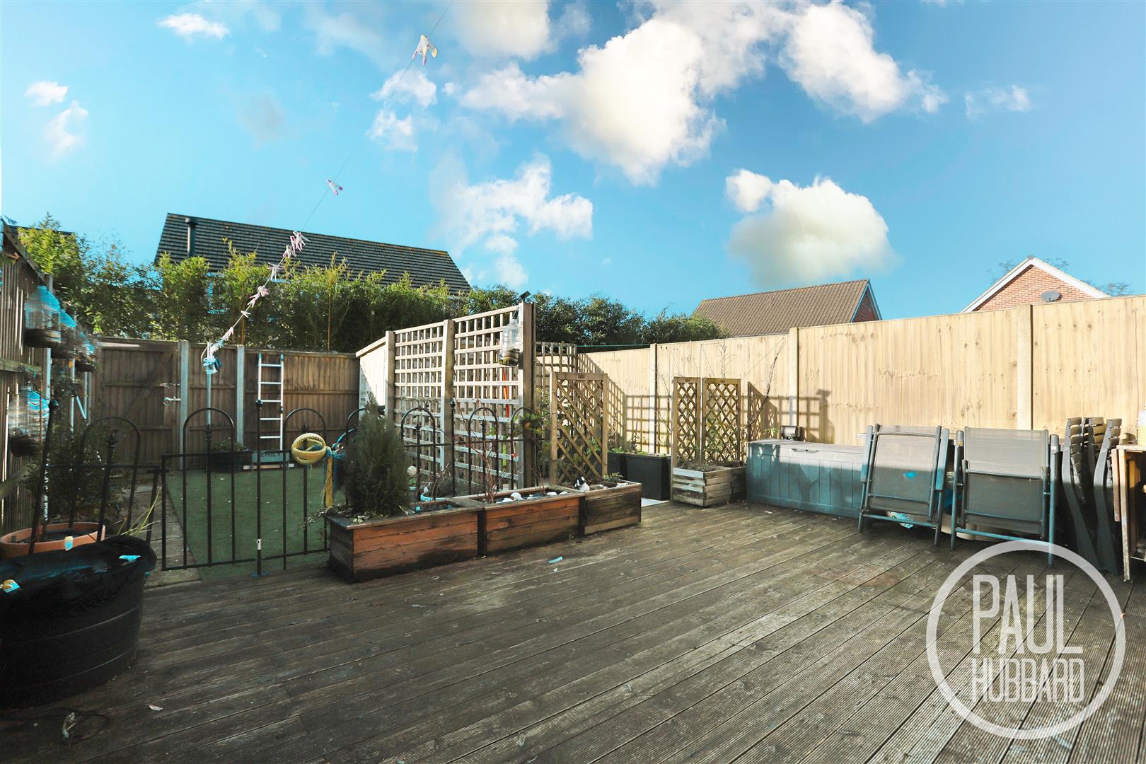 The south-west facing rear garden is designed for low maintenance, featuring an artificial lawn, decking and patio areas, a built-in awning over the decking, outdoor tap, power socket, and lighting. The garden is fully enclosed by panel fencing and benefits from gated rear access.