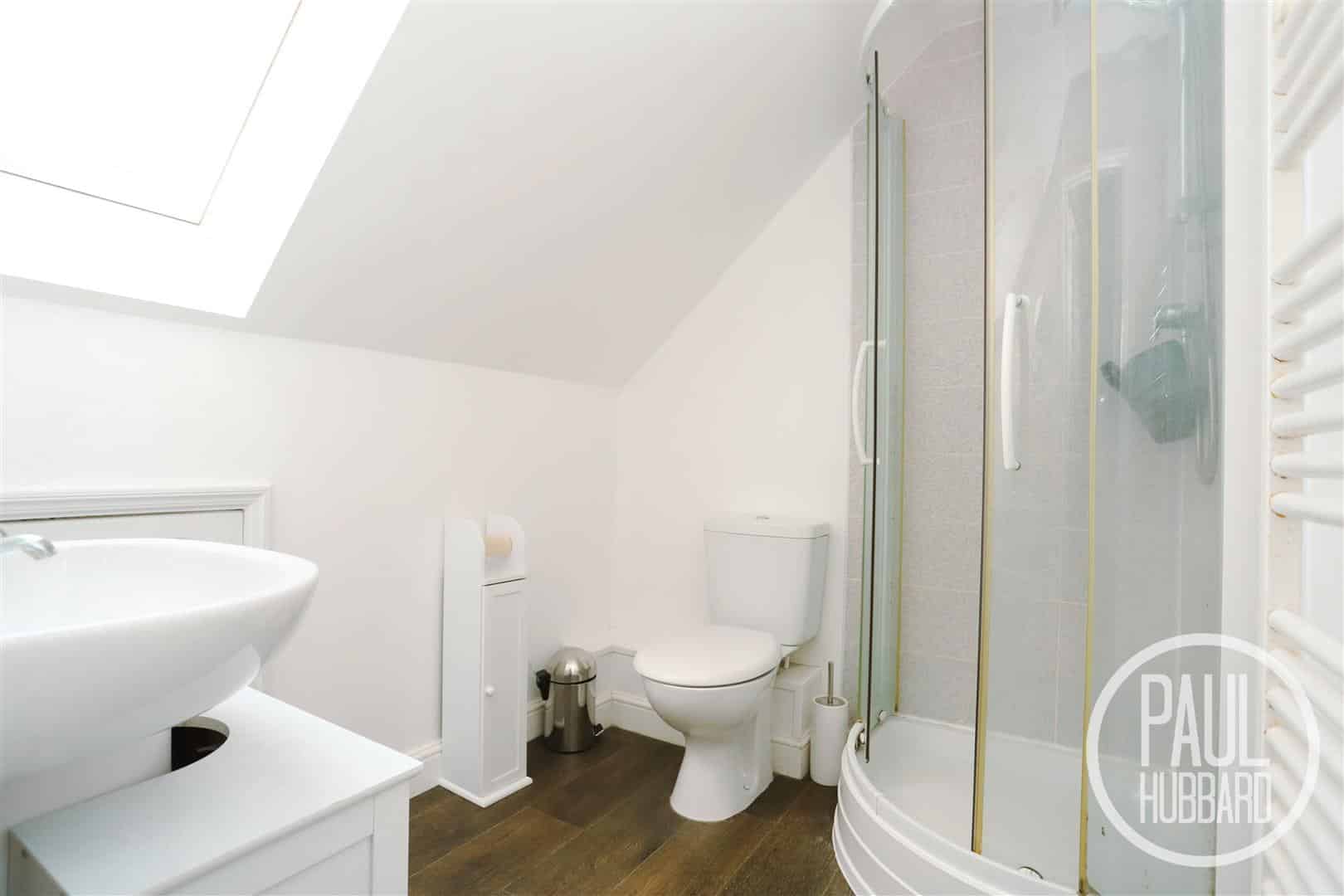 Laminate flooring, Velux window, eaves storage, heated towel rail, toilet, wash basin set into a vanity into with hot & cold taps, a mainsfed shower set into a cubicle enclosure, tile splash backs and an extractor fan with light.