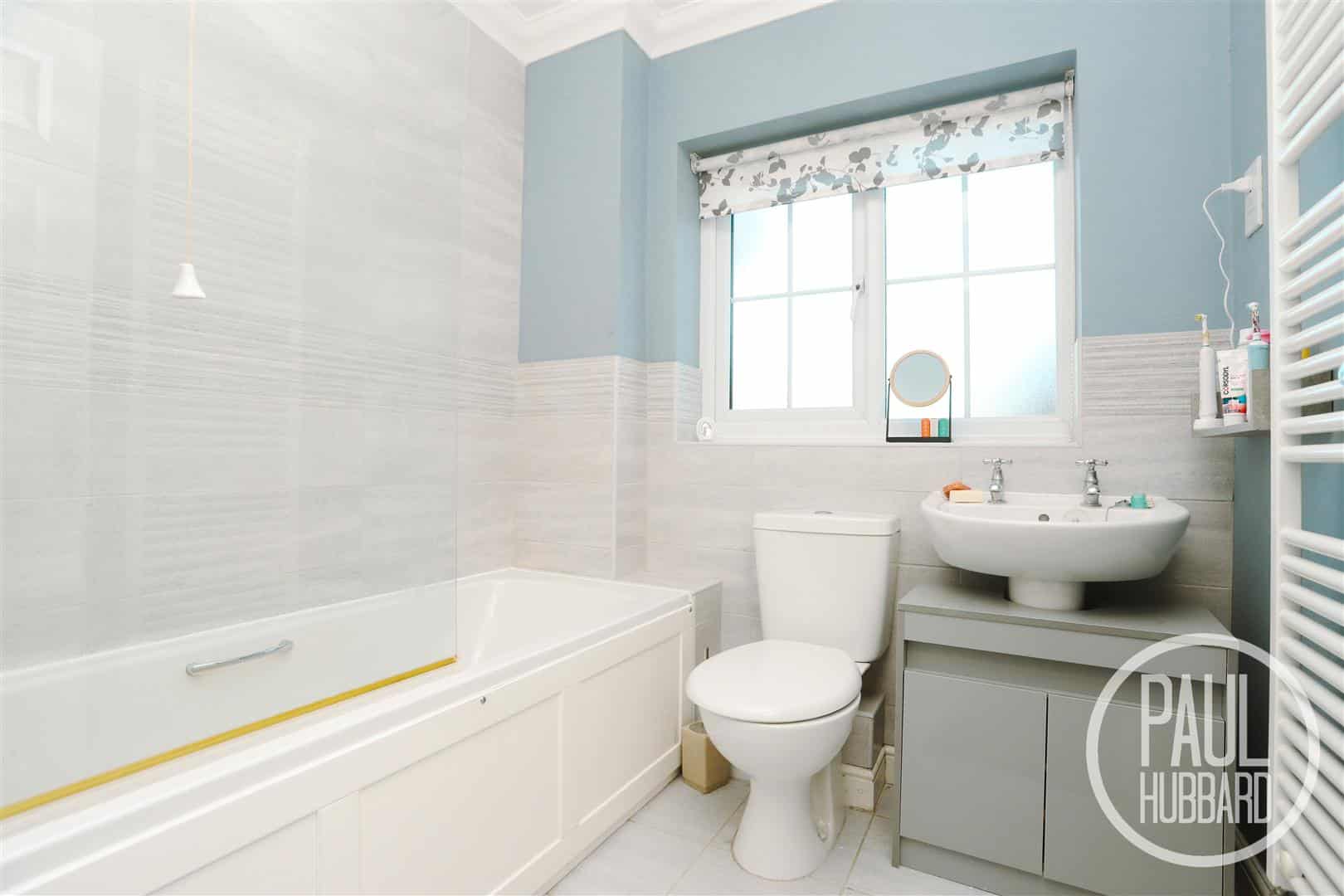 Tile flooring, UPVC double glazed obscure window to the front aspect, heated towel rail, extractor fan, tile splash backs, toilet, pedestal wash basin with hot & cold taps, panelled bath with a mixer tap and a handheld shower attachment.