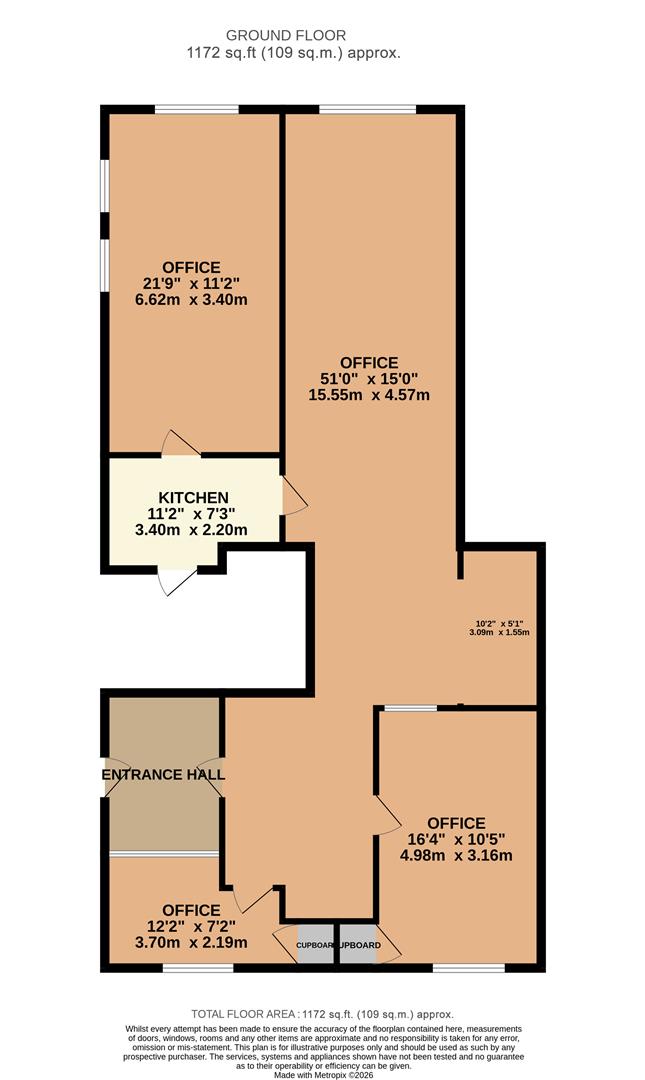 The accommodation extends to approximately 1,172 sq ft and is arranged to offer a mix of individual offices, meeting rooms, and open working areas, making it well suited to occupiers seeking a more traditional and self-contained office environment. The layout lends itself equally to professional practices, growing businesses, or occupiers requiring a combination of private rooms and collaborative space.