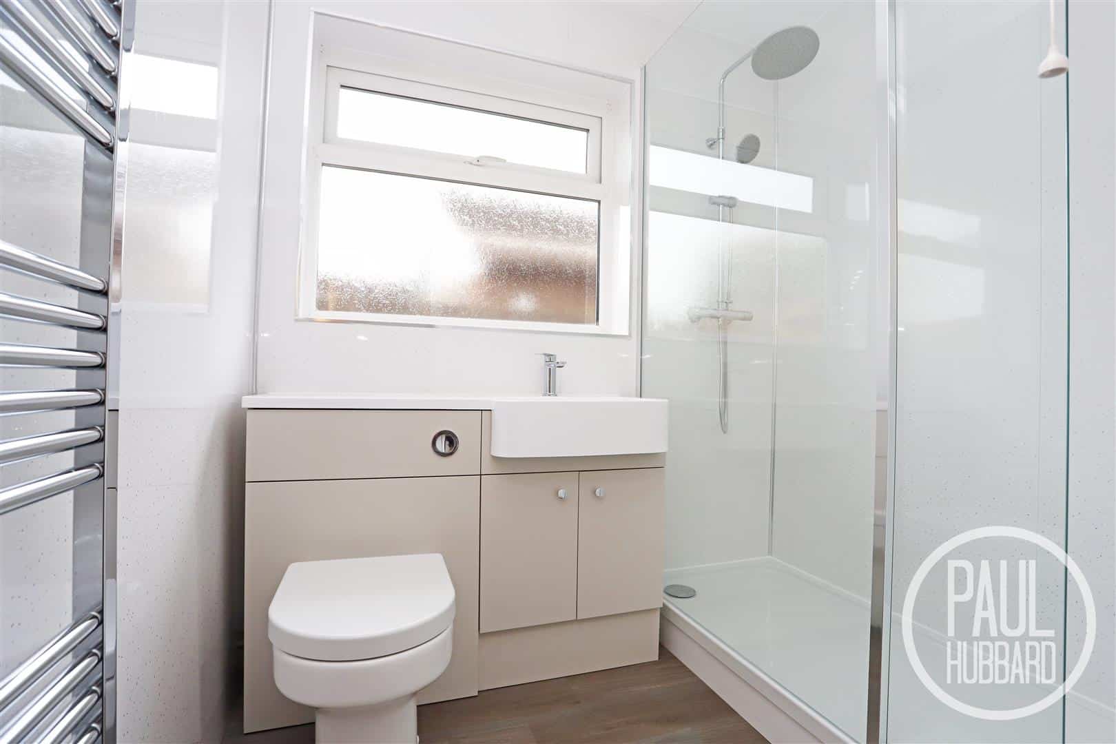 Laminate flooring, UPVC double glazed obscure window to the side aspect, heated towel rail, toilet & wash basin set into a vanity unit with a mixer tap, walk-in mains-fed shower with both handheld & rainfall heads, aqua board wall panels and spotlights.